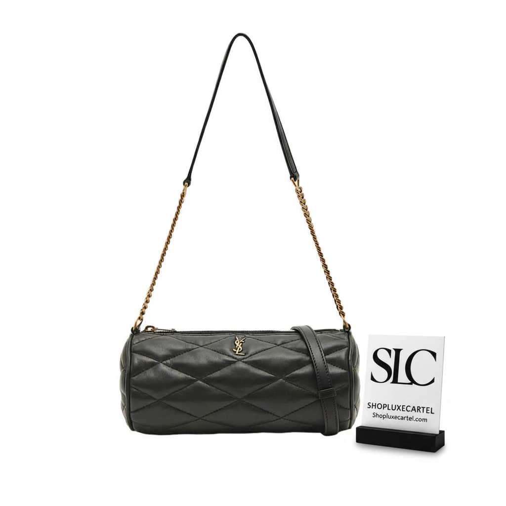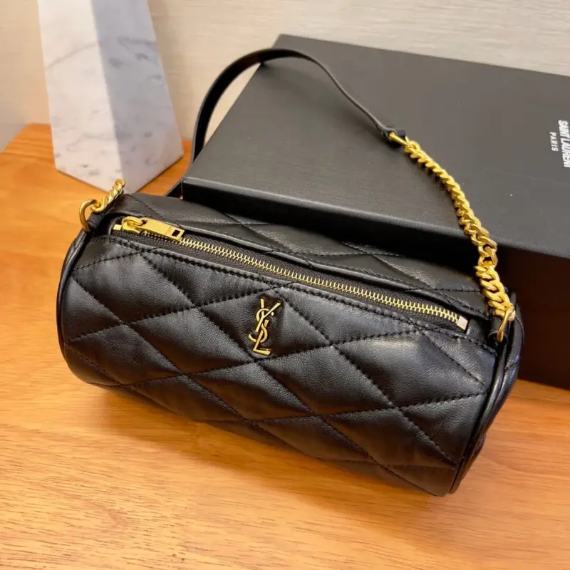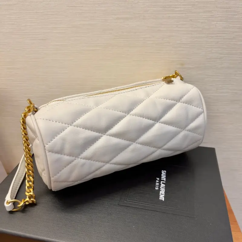 Discover a modern accessory with a unique, cylindrical silhouette. This compact tube-shaped bag is distinguished by its plush, diamond-quilted overstitching, offering a sophisticated texture that’s soft to the touch. It’s the perfect size for carrying your daily essentials with effortless style.