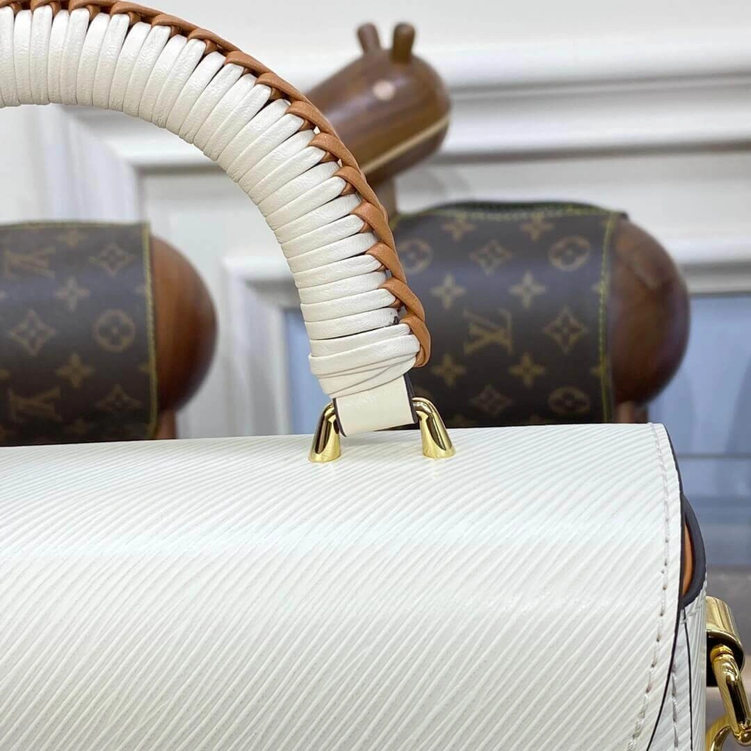 Discover a masterpiece of contemporary design with this beautifully structured top handle bag. Crafted from distinctly textured Epi leather, this bag showcases a unique, wave-like embossing that is both visually striking and exceptionally durable. The clean, graphic silhouette is enhanced by artisanal braided leather detailing on the top handle and the sculptural, interlocking turn-lock closure. This piece combines a sophisticated aesthetic with practical versatility for a truly modern accessory.
