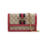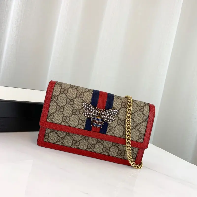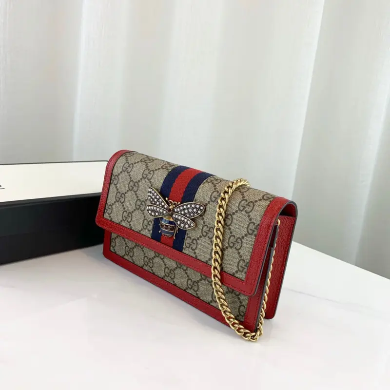 This elegant mini shoulder bag offers a sophisticated blend of classic design and whimsical detail. Crafted from a durable coated canvas featuring a timeless geometric print, it is beautifully accented with rich red leather trim and a signature striped webbing detail. The standout feature is a stunning metal bee, intricately decorated with luminous pearls and vibrant, multi-colored crystals, adding a touch of vintage-inspired charm.