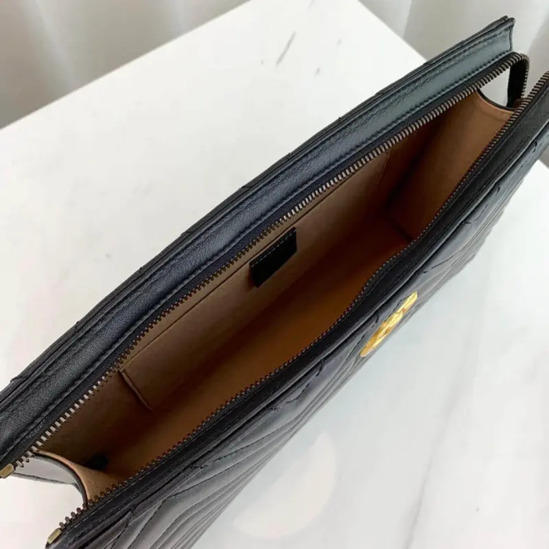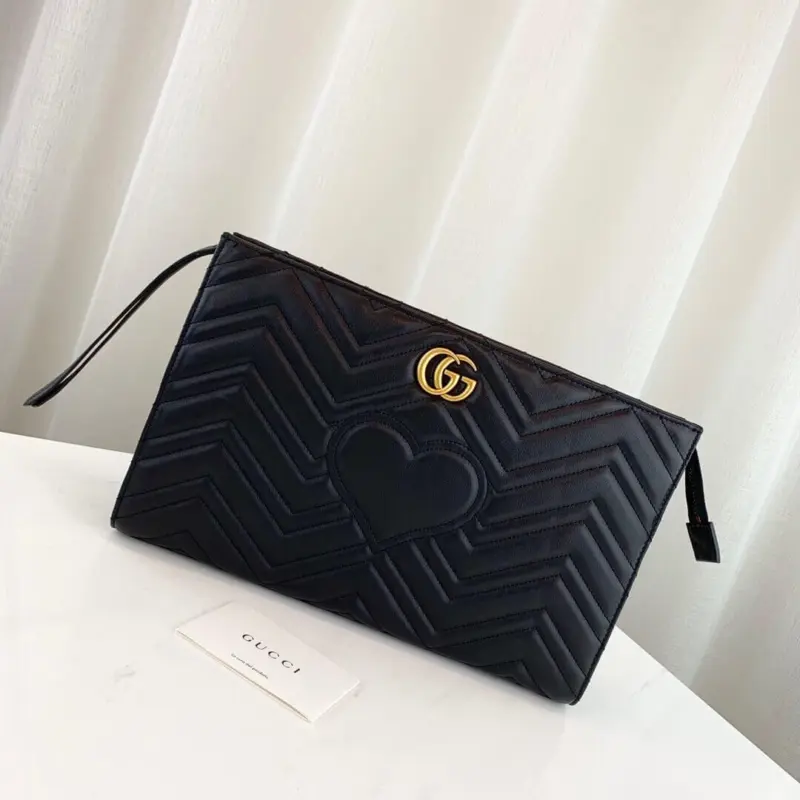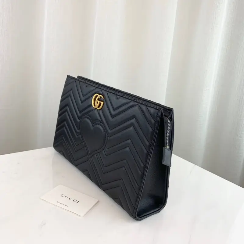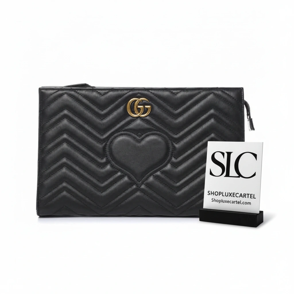 The clutch is distinguished by its refined details, including a charming stitched heart on the back and a prominent double-letter emblem in an aged-gold finish on the front. A secure top zipper opens to reveal a contrasting beige interior, thoughtfully designed with a flat pocket to keep your essentials organized. This piece is a testament to luxurious style and impeccable craftsmanship.
