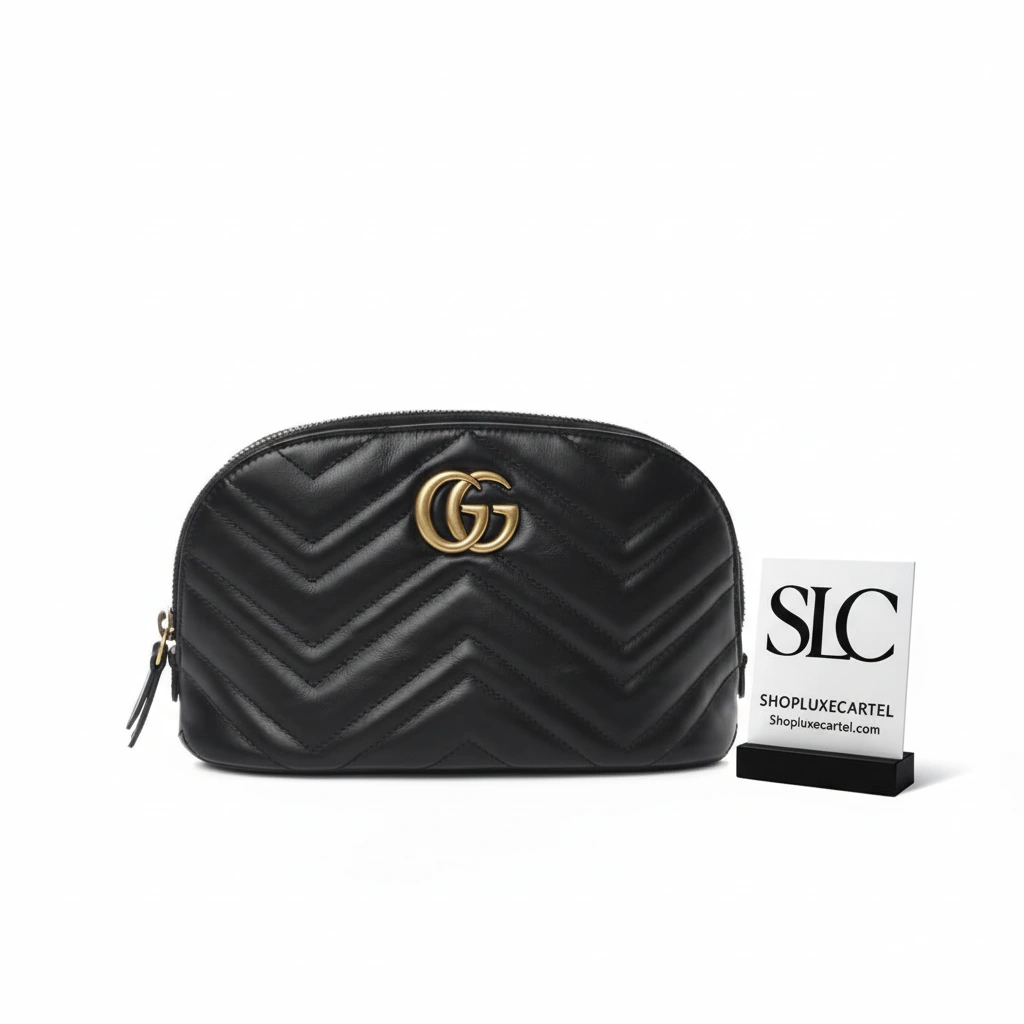 Discover timeless elegance with this beautifully crafted travel case, designed to keep your cosmetics and essentials perfectly organized. Made from supple black leather with a sophisticated quilted chevron finish, this pouch combines classic style with practical functionality. Its compact yet spacious design makes it an ideal companion for both daily use and travel, easily fitting into a larger bag.