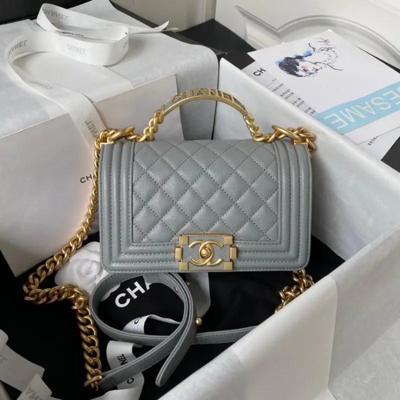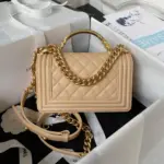Experience timeless sophistication with this exquisitely crafted flap bag, a testament to classic design and luxurious materials. Rendered in a beautifully grained and shiny calfskin, its structured, quilted silhouette exudes an air of polished elegance. The convenient top handle offers a chic carrying option, making this piece a versatile and indispensable addition to any wardrobe.