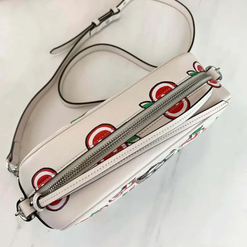 Experience a delightful blend of playful charm and classic style with this expertly crafted camera shoulder bag. Its softly structured design is rendered in supple white quilted leather, brought to life by a whimsical, repeating apple and geometric emblem print. This compact accessory is perfect for adding a touch of personality to any outfit, from casual daywear to elegant evening looks.