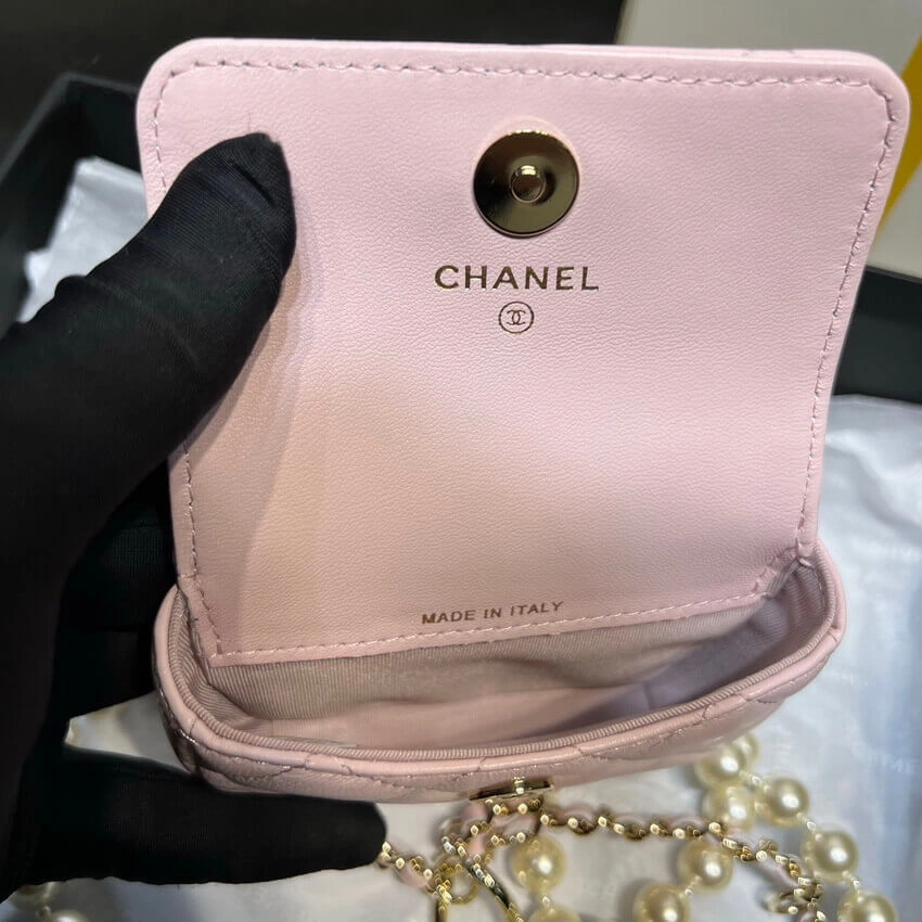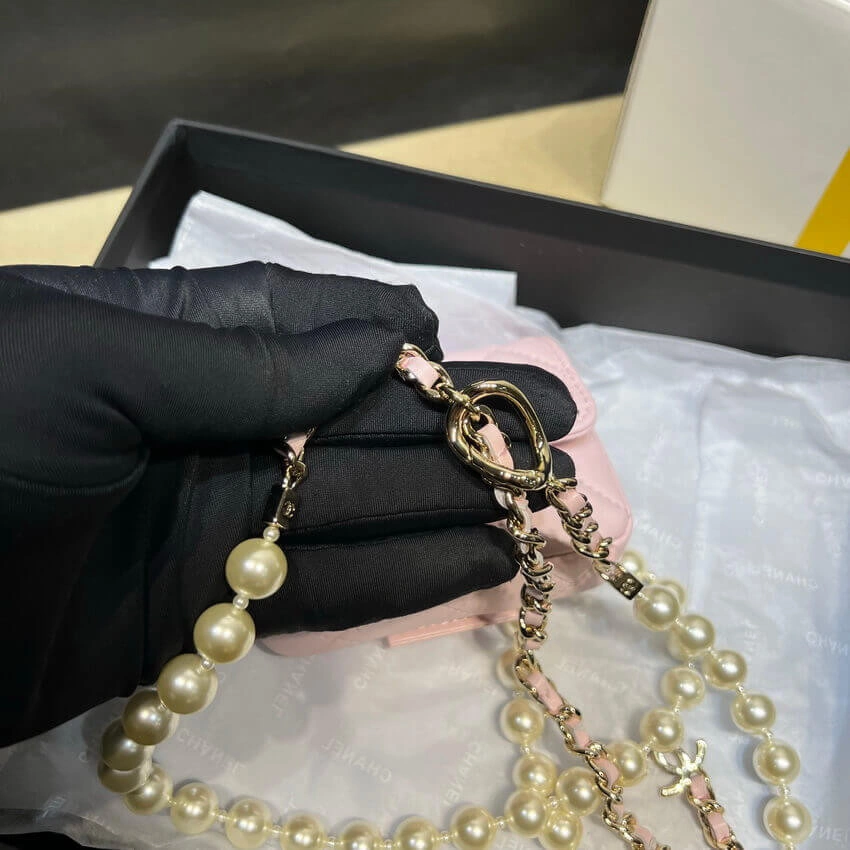 This compact and functional piece is thoughtfully designed for modern lifestyles, keeping your essentials secure and accessible. It is beautifully adorned with lustrous imitation pearls and polished gold-tone metal hardware, adding a refined and luxurious finish. The adjustable strap ensures a comfortable, custom fit around the waist for effortless wear.