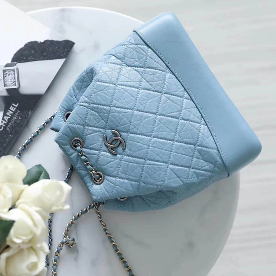 Discover a truly unique accessory that blends timeless quilting with a contemporary silhouette. This small backpack is crafted from a sophisticated combination of aged and smooth calfskin, creating a rich textural contrast. The design features a distinctive drawstring closure and versatile, multi-tonal metal hardware in gold-tone, silver-tone, and ruthenium finishes for a modern edge.