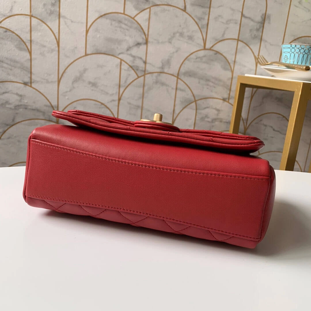 Discover a piece that radiates pure elegance and modern sophistication. This beautifully structured flap bag is crafted from supple lambskin leather, offering a luxurious feel and a subtle sheen that catches the light. Its most striking feature is a distinctive top handle, artfully constructed from three interconnected woven chain and leather links, creating a bold and eye-catching detail that sets this bag apart.