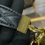 Designed for versatility, this piece features both a detachable top handle for handheld carrying and a removable sliding chain for shoulder or crossbody wear. The light gold-finish hardware adds a touch of brilliance, securing with a distinctive twist-lock clasp that is both stylish and functional. The well-organized interior includes multiple pockets, one with a convenient mirror, to keep essentials in order.