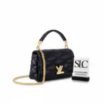 The bag’s refined silhouette is complemented by light gold-tone hardware and a secure flap top with a classic twist-lock closure. The interior, lined in smooth cowhide, is thoughtfully organized with a rear zippered pocket and a convenient flat pocket that includes a mirror, making it a perfect blend of high fashion and practical design.