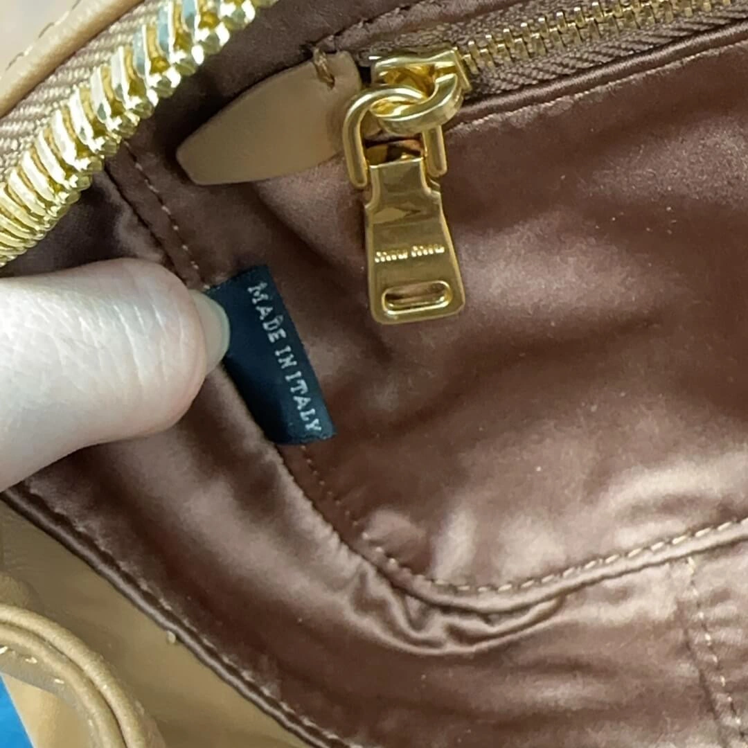 This piece is designed for adaptability, featuring elegant leather handles and a detachable, adjustable shoulder strap for multiple carrying options. Finished with polished gold-tone hardware, the bag combines refined aesthetics with practical features, including a secure zipper closure, a removable mirror case, and a cotton satin-lined interior to keep your essentials organized.