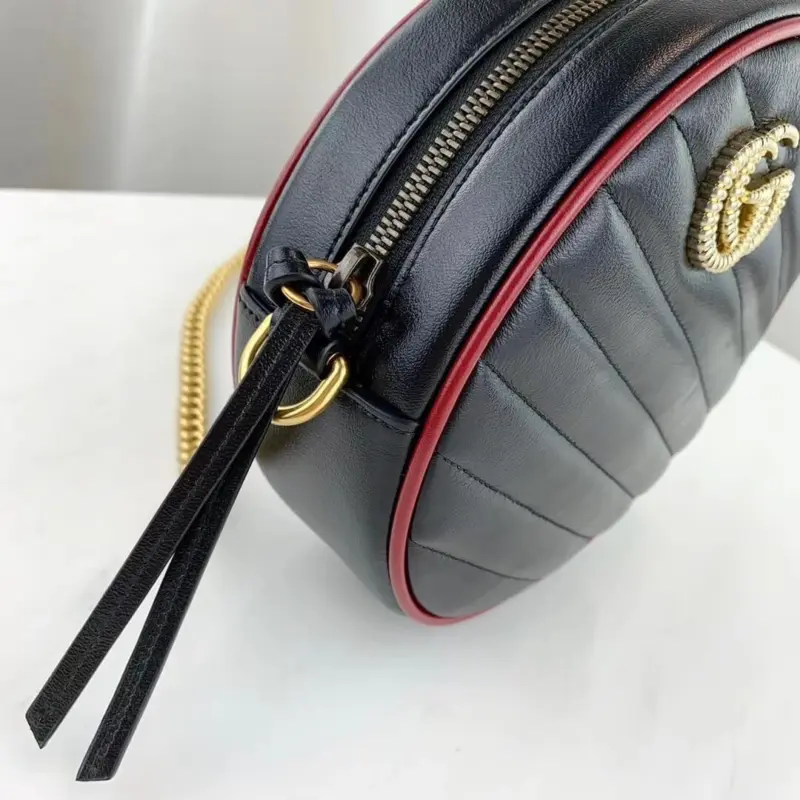 Discover a charming and playful circular silhouette with this mini camera bag. Expertly crafted from diagonally quilted leather with a sophisticated vintage effect, this bag offers a unique and eye-catching texture. Its compact design is perfect for carrying your essentials, while the versatile chain strap allows it to be worn comfortably as a shoulder bag or a stylish crossbody.