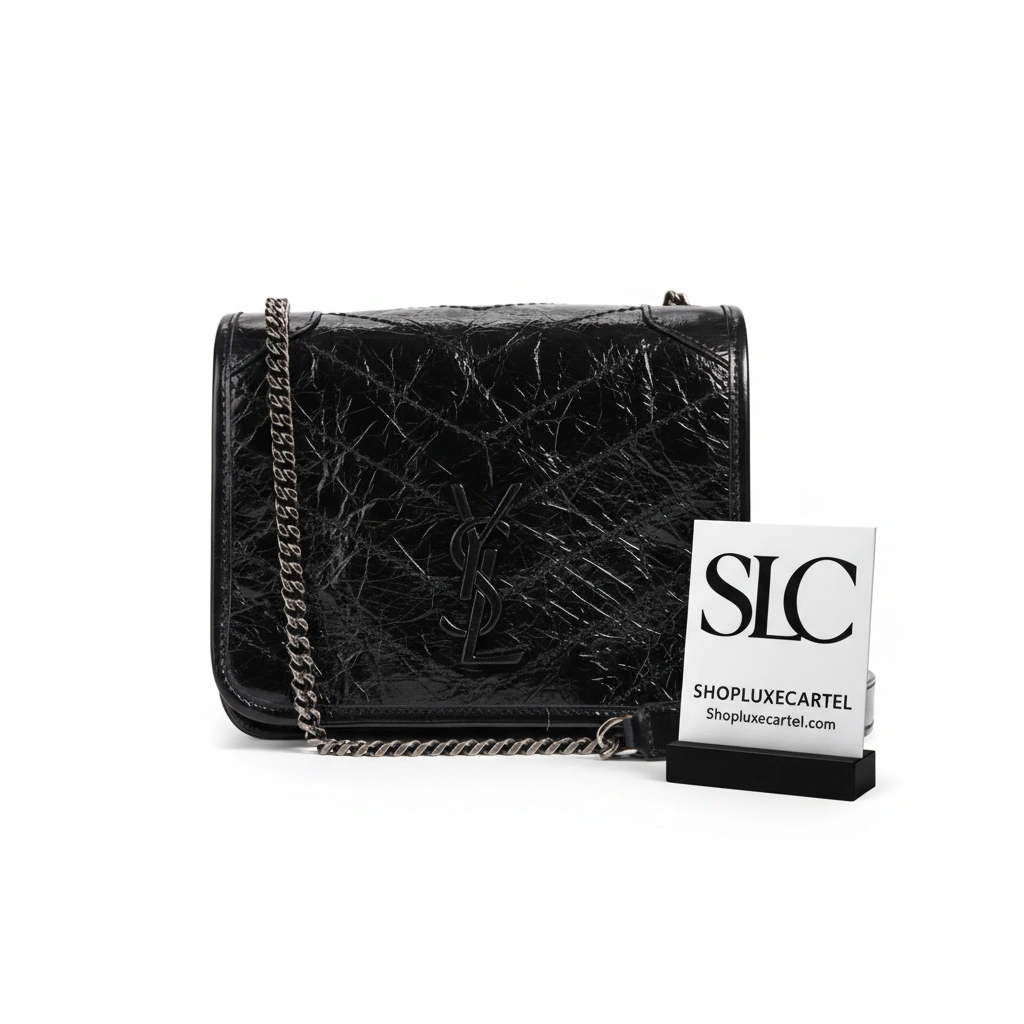Experience a seamless blend of timeless style and modern functionality with this versatile wallet on a chain. Expertly crafted from crinkled, vintage-effect leather, this piece showcases elegant quilted overstitching for a touch of classic sophistication. Its refined silhouette is designed for adaptability, featuring a removable chain strap that allows it to be worn over the shoulder or carried as a chic clutch.