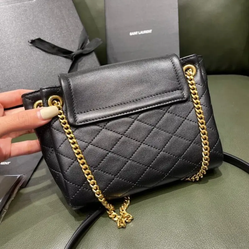 The bag’s versatile design is enhanced by a sliding chain strap, reinforced with leather for comfort, which can be easily adjusted to wear over the shoulder or across the body. The front flap is secured with a magnetic closure and is tastefully decorated with a polished interlocking metal accent, while the bronze-toned hardware provides a warm, refined finish.