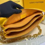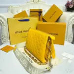 Make a vibrant statement with this stunning shoulder bag, crafted from exceptionally soft, puffy lambskin in a brilliant yellow. The bag’s plush, cushioned body is accentuated with an allover embossed pattern, creating a sophisticated texture that’s both modern and timeless. A substantial, polished gold-tone chain adds a touch of glamour, making it a versatile accessory for any look.