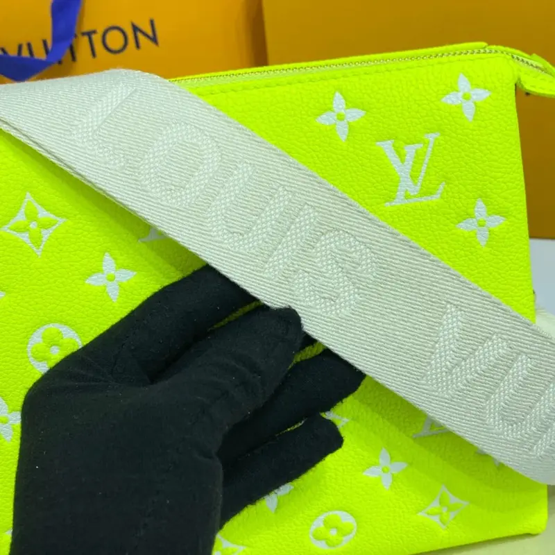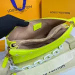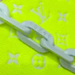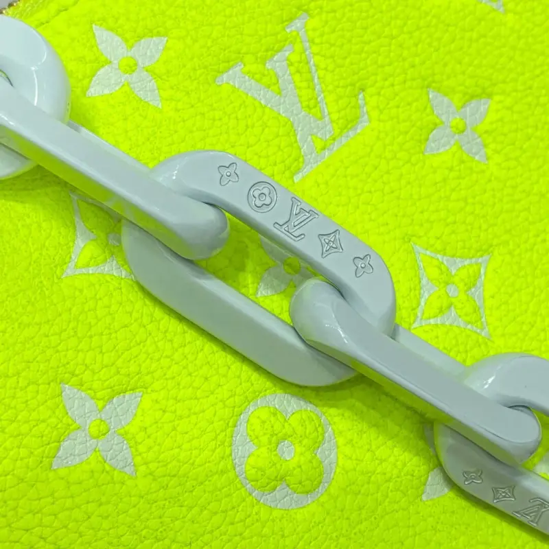 Make a bold statement with this stunning shoulder bag, crafted from incredibly soft, puffy calfskin in a vibrant fluorescent yellow. The plush, quilted body is embossed with a sophisticated geometric pattern, creating a unique texture and visual appeal. A chunky, detachable chain crafted from contrasting white acetate adds a modern, graphic touch, allowing for an elegant shoulder carry.