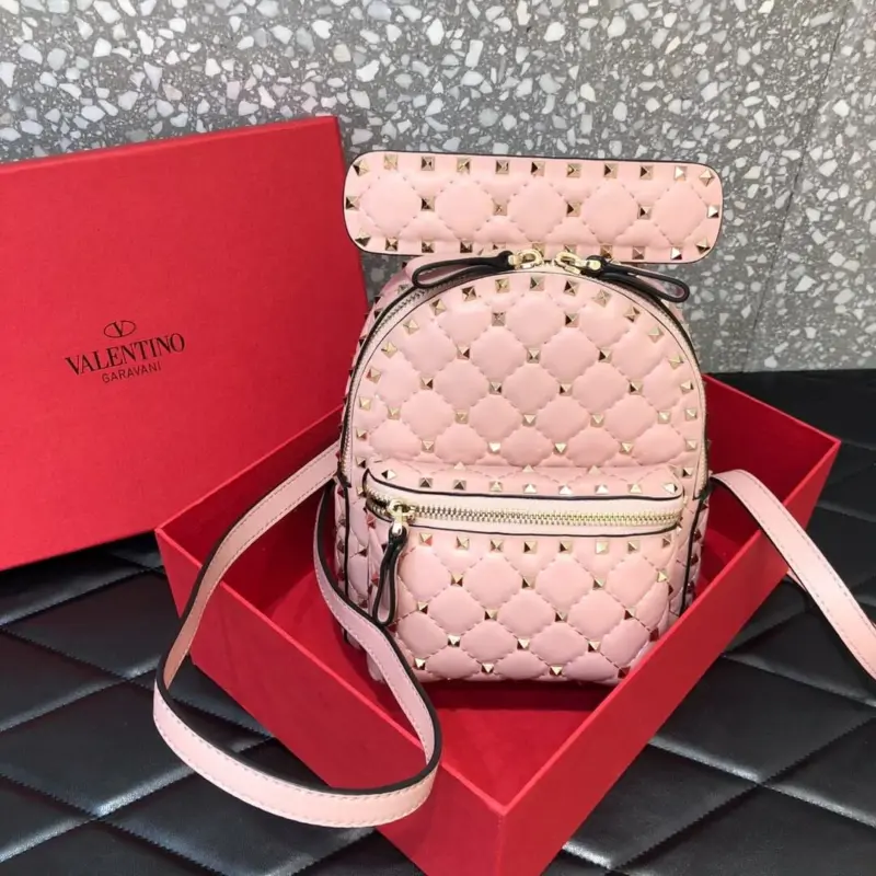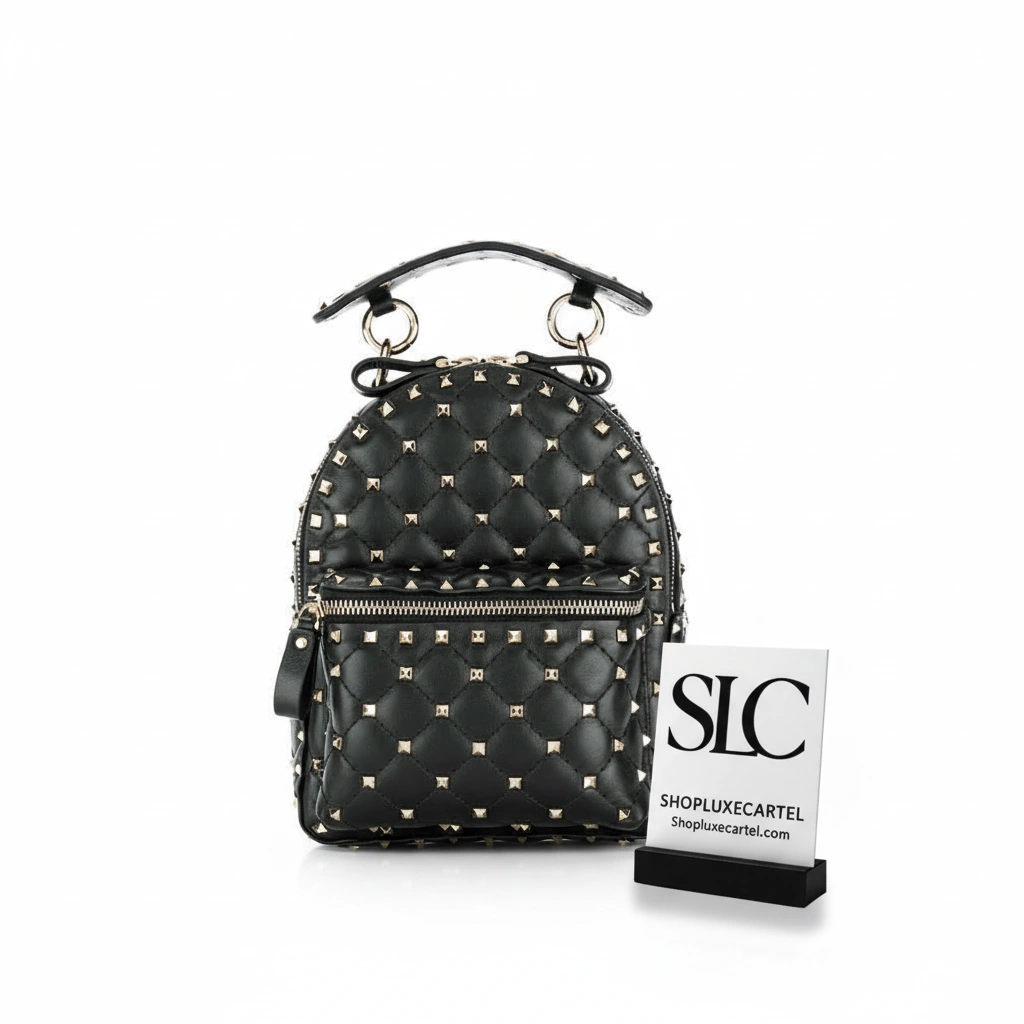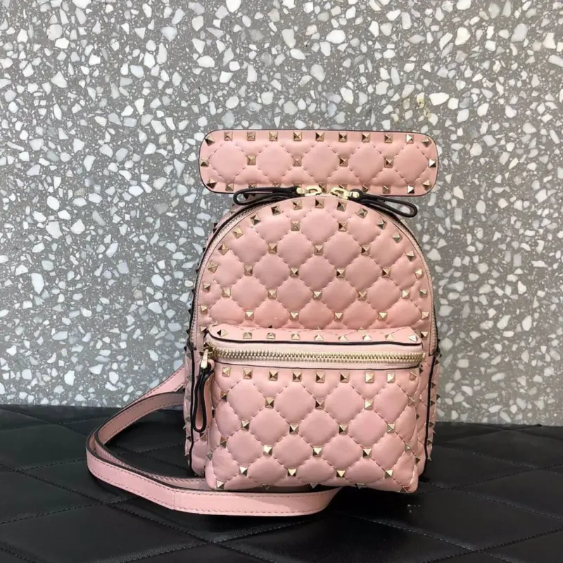 Discover a truly versatile accessory with this beautifully crafted mini backpack. Made from supple, quilted lambskin leather, this bag offers a compact and stylish solution for carrying your essentials. The design is distinguished by a sophisticated rhombus pattern, highlighted by tone-on-tone stitching and punctuated with polished, platinum-finish pyramid studs for an edgy yet elegant look.