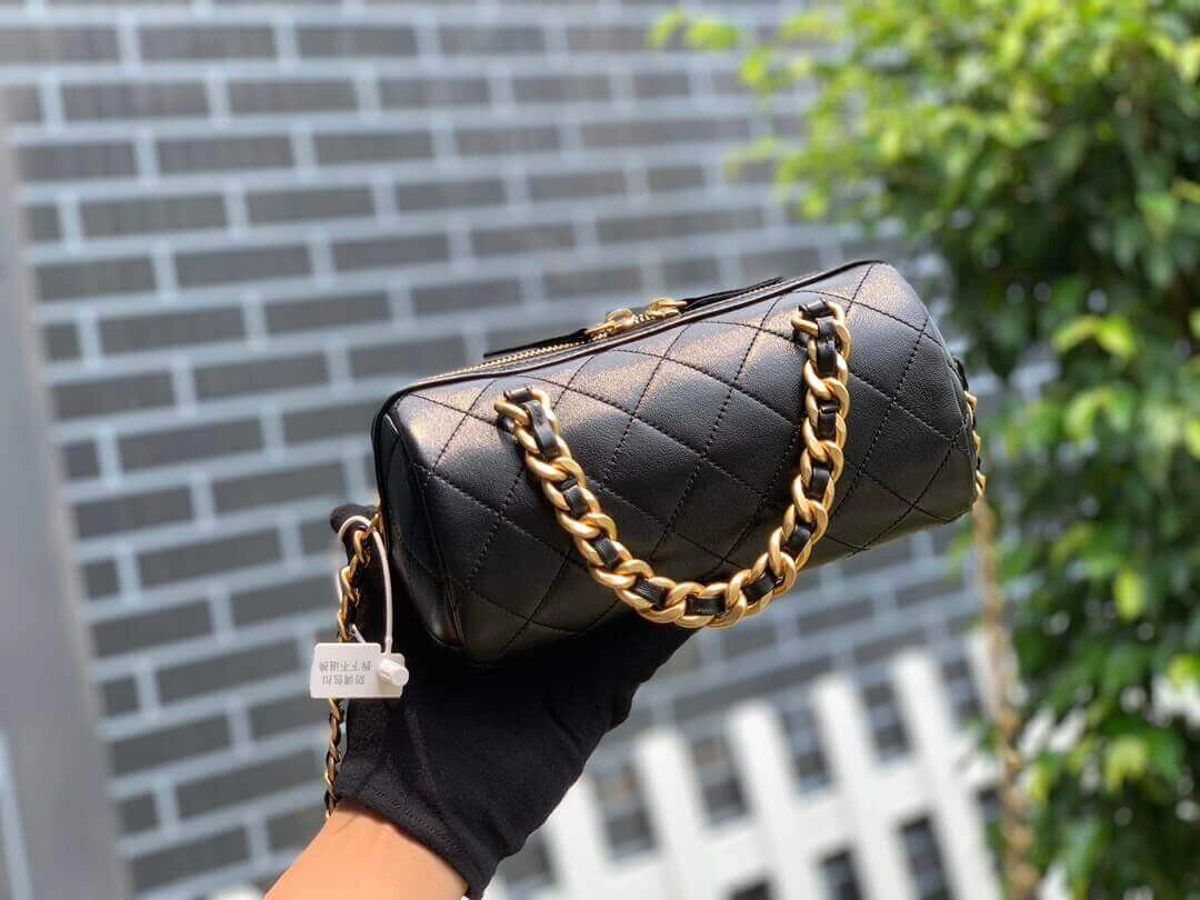 Discover timeless elegance with this beautifully structured small bowling bag. Crafted from a lustrous, shiny lambskin, this piece features a classic quilted finish that exudes sophistication and textural appeal. Its compact, vintage-inspired silhouette is perfect for both day-to-night transitions, offering a chic and polished look for any wardrobe.