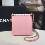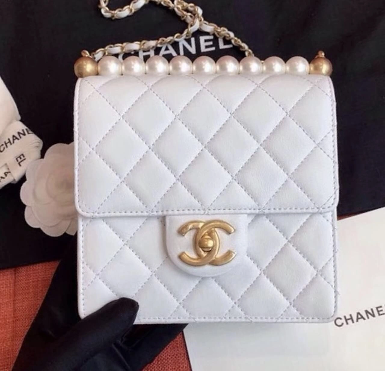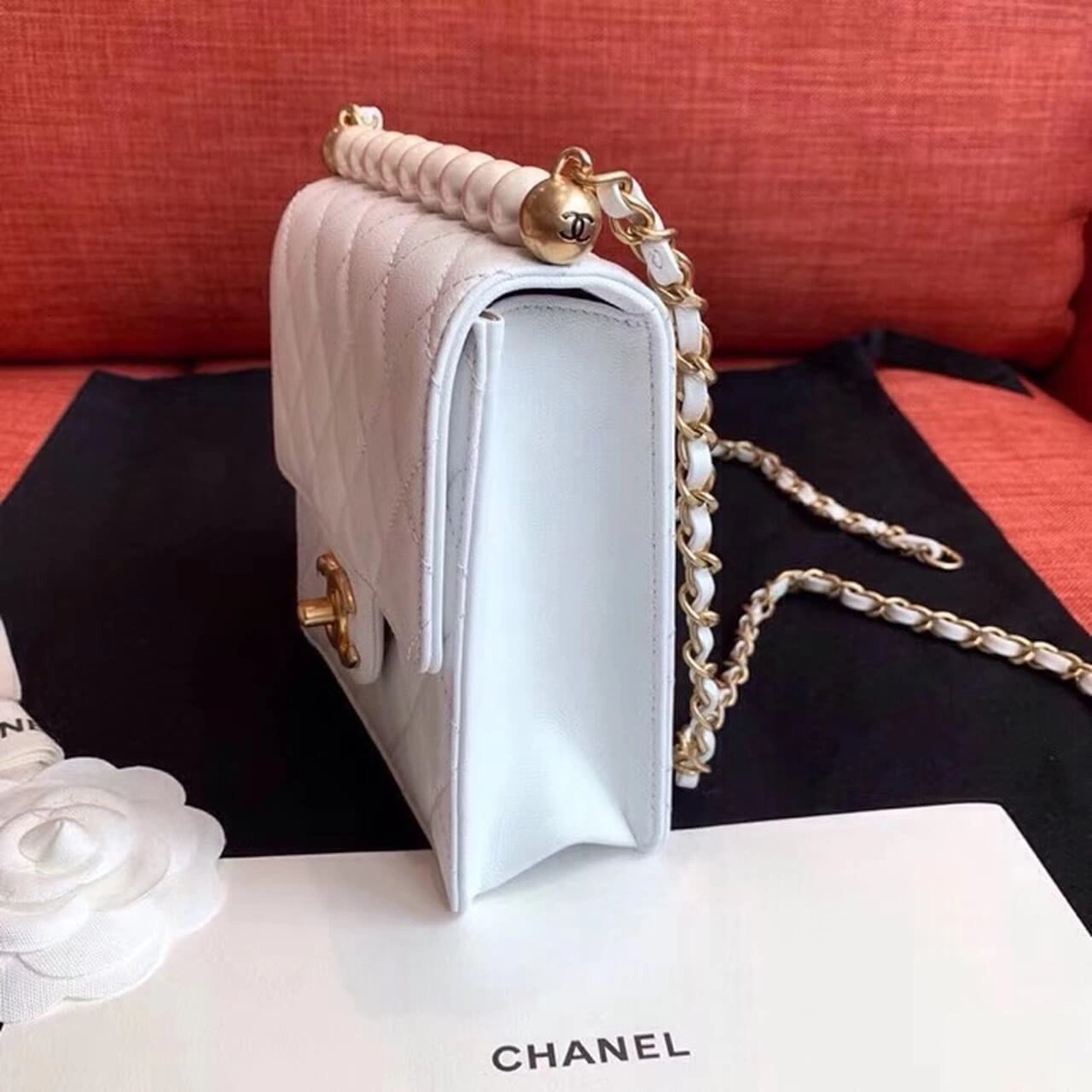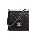 This elegant small flap bag combines timeless design with luxurious details. Crafted from incredibly soft, quilted lambskin, it offers a sophisticated texture and a chic, structured shape. The design is highlighted by a stunning top handle made of lustrous imitation pearls, adding a touch of classic glamour to the silhouette.