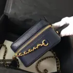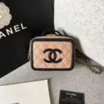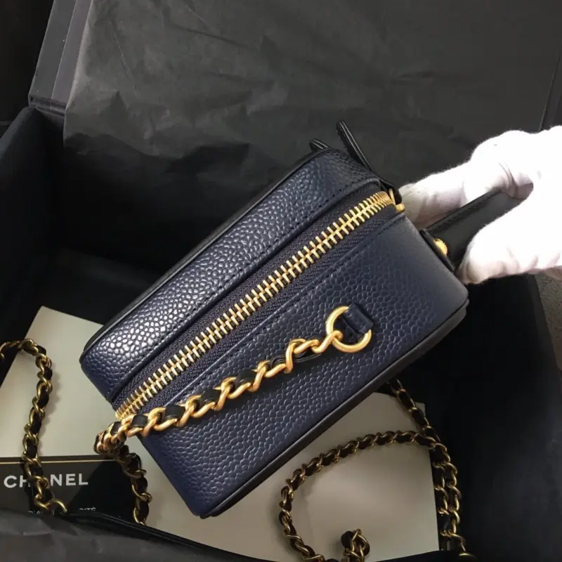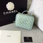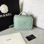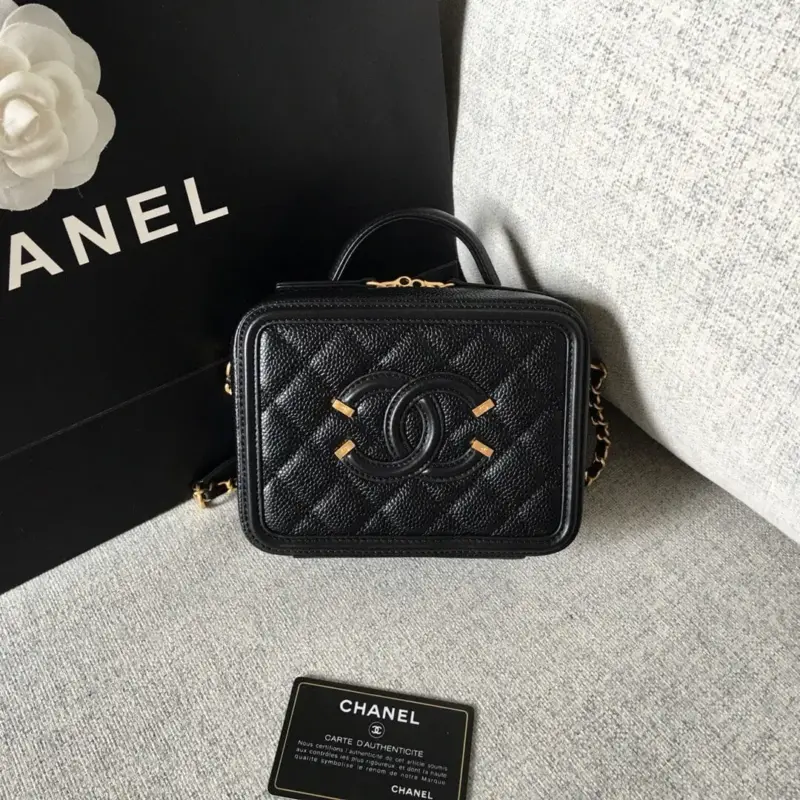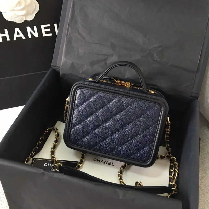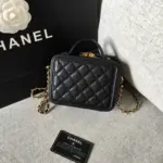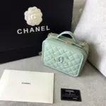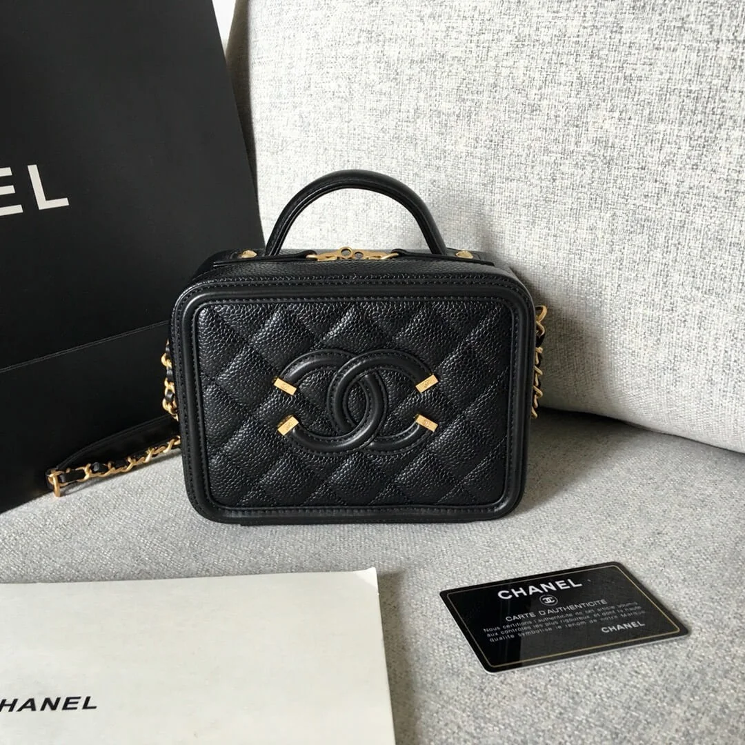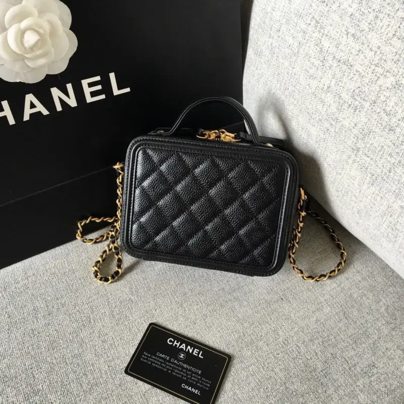 Discover a timeless accessory in this beautifully structured small vanity case. Expertly crafted from textured calfskin with a classic quilted pattern, this piece offers enduring style and durability. Its compact, upright silhouette is perfect for organizing your essentials, while the elegant top handle ensures easy and comfortable carrying. Finished with polished gold-tone hardware, this case is a sophisticated addition to any collection.