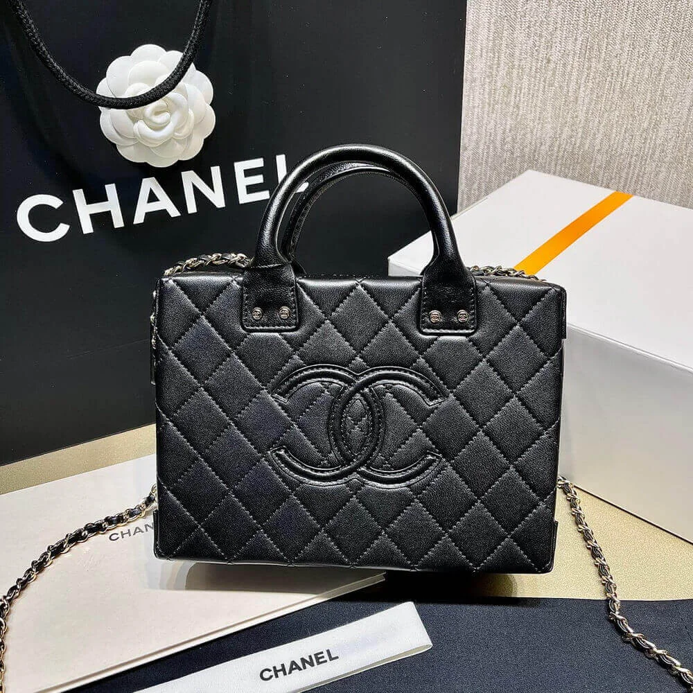 Quilted Top Handle Cosmetic Vanity Case in Black Calfskin AS3345