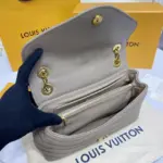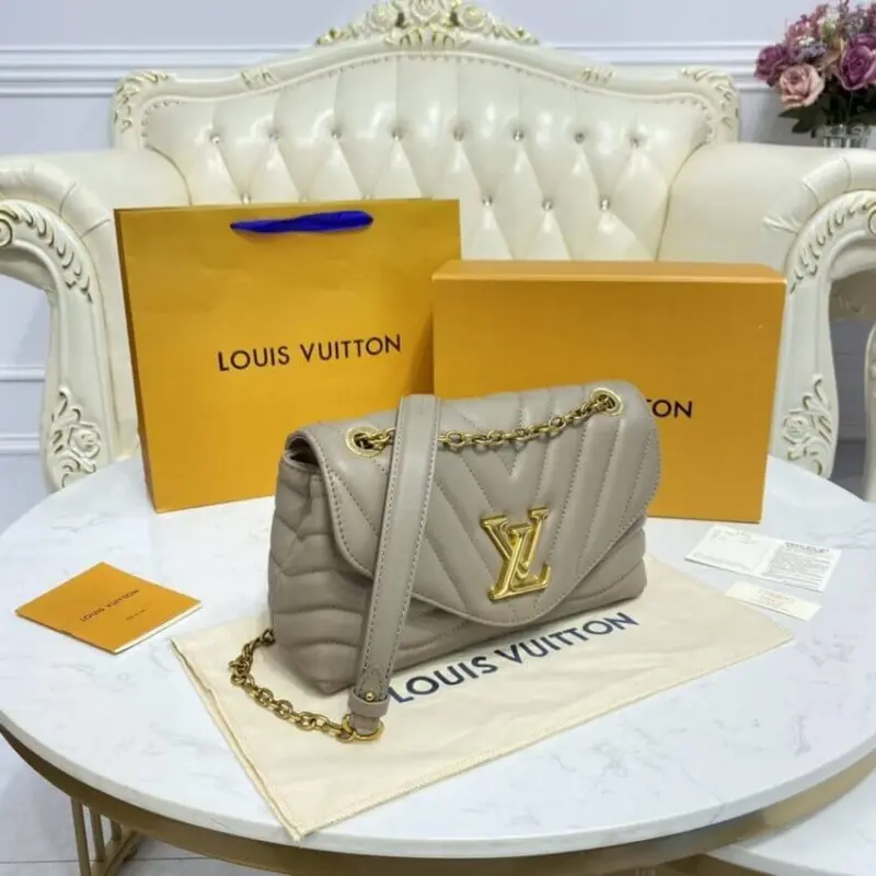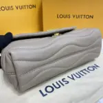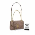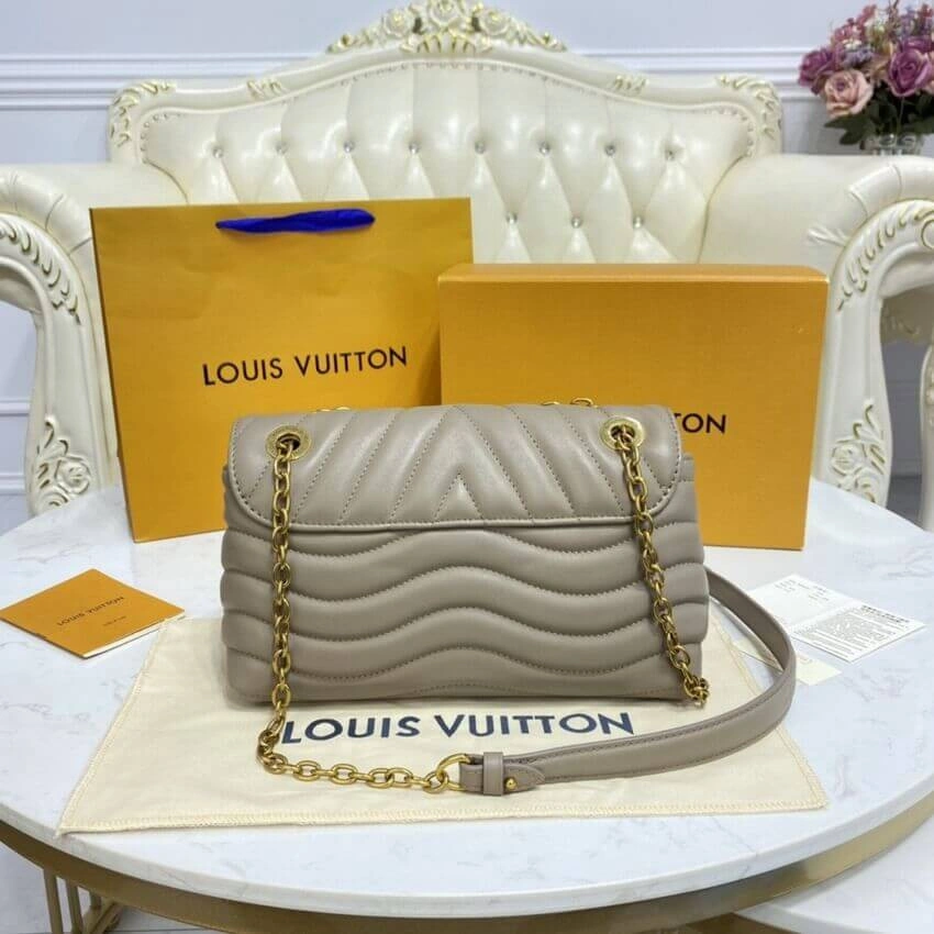 This beautifully crafted shoulder bag showcases a distinctive wave-like quilting on its supple, smooth cowhide leather exterior. Presented in a sophisticated dark taupe, its elegant silhouette is enhanced by vintage gold-tone hardware and a versatile sliding chain strap. The thoughtful design, featuring folded side gussets, ensures a comfortable and body-friendly fit.
