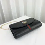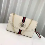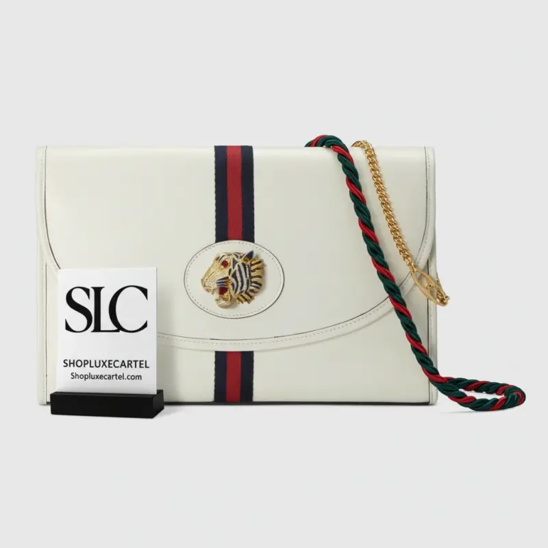 This medium shoulder bag presents a sophisticated fusion of timeless style and distinctive detailing. Crafted from smooth white leather, it provides versatile carrying options with two distinct straps: a short, polished chain strap and a longer, detachable striped torchon strap. The bag’s focal point is a striking, enameled tiger head, intricately decorated with sparkling crystals that evoke the glamour of vintage jewelry.