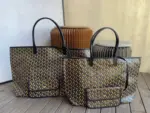 - Crafted from durable coated canvas with a signature chevron print and genuine calfskin leather trim.