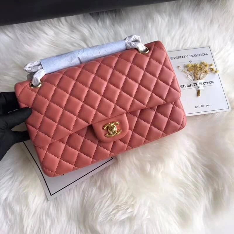 Experience unsurpassed elegance with this beautifully crafted flap bag, a timeless accessory that brings a touch of class to any occasion. Rendered in a stunning rose quartz hue, this piece is a wardrobe staple, defined by its signature quilted lambskin leather and gleaming, polished chain hardware. The beautifully structured design ensures you will be the talk of the town, no matter where you go.