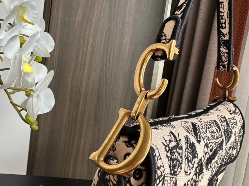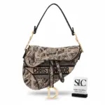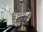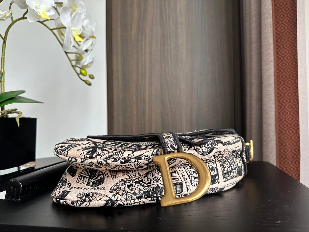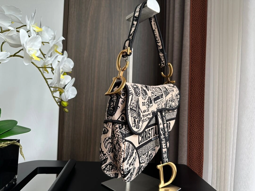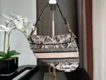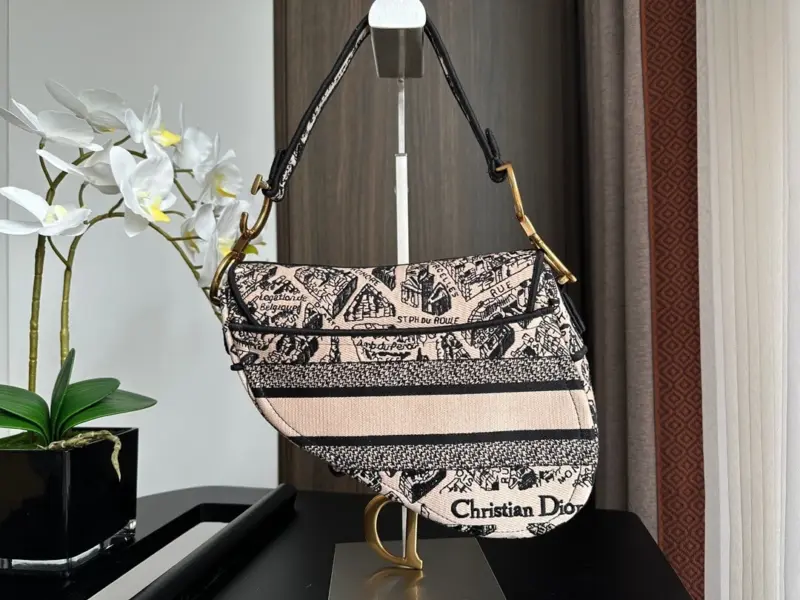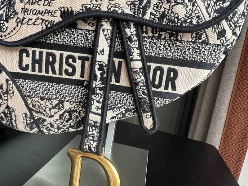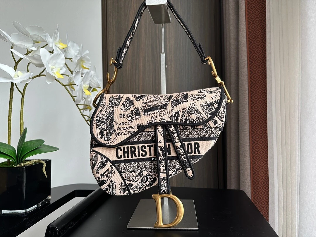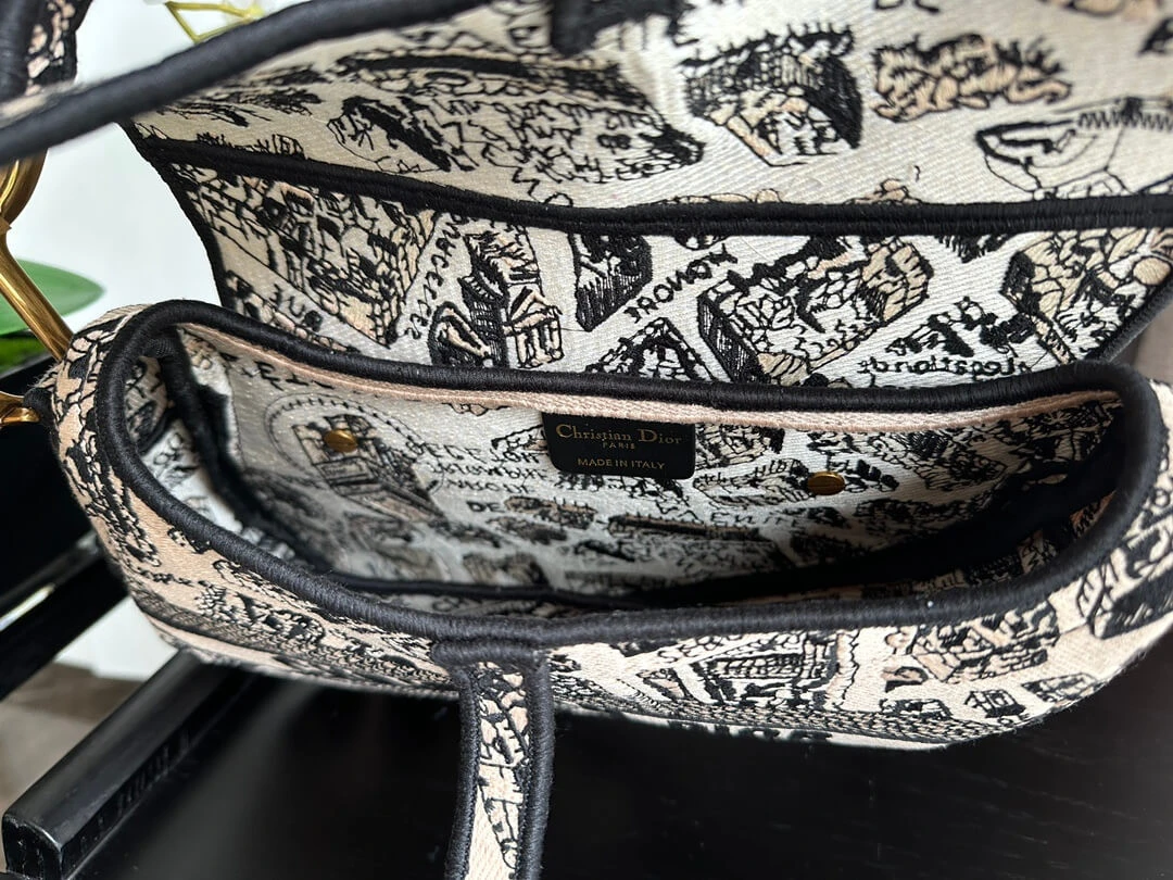 This beautifully crafted shoulder bag features an iconic, equestrian-inspired silhouette, updated with a fresh and intricate design. The entire piece is adorned with elegant beige and black embroidery depicting a historical map of Paris, a motif drawn from celebrated design archives. This legendary style brings a touch of timeless sophistication to any collection.