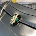 The bag’s most captivating feature is its ornate, serpent-inspired flap closure, meticulously crafted from light gold-plated brass and adorned with colored enamel and brilliant black onyx-style eyes. A delicate, matching star charm adds a whimsical touch. The light gold-plated chain strap is inspired by the sinuous form of a snake, allowing the bag to be worn comfortably on the shoulder or across the body.