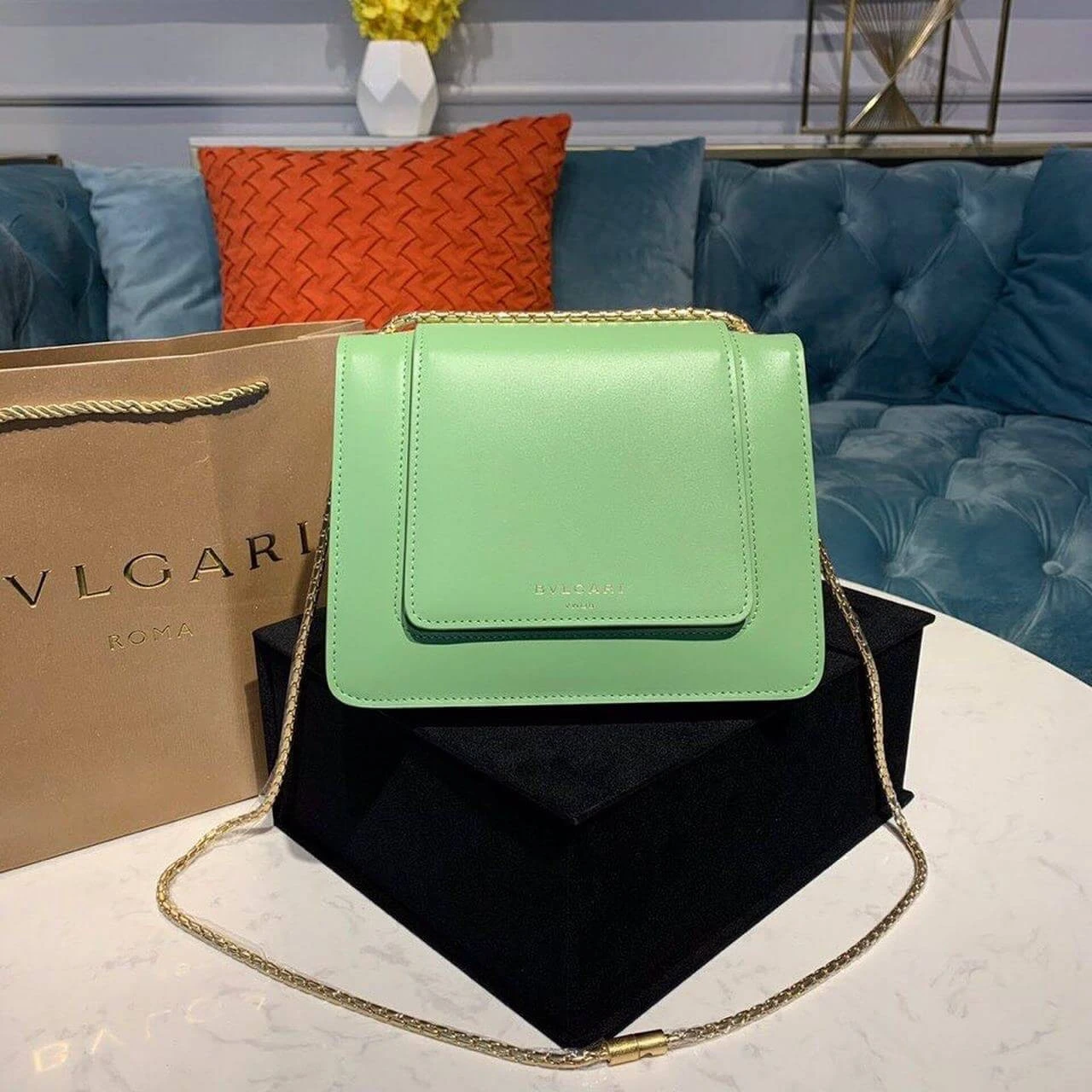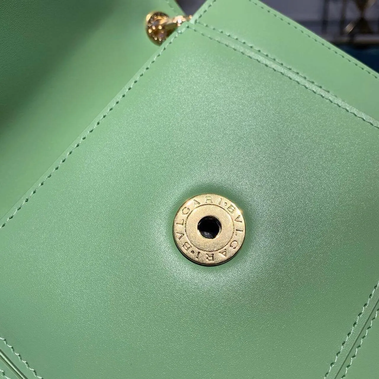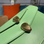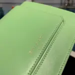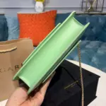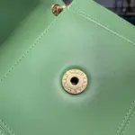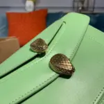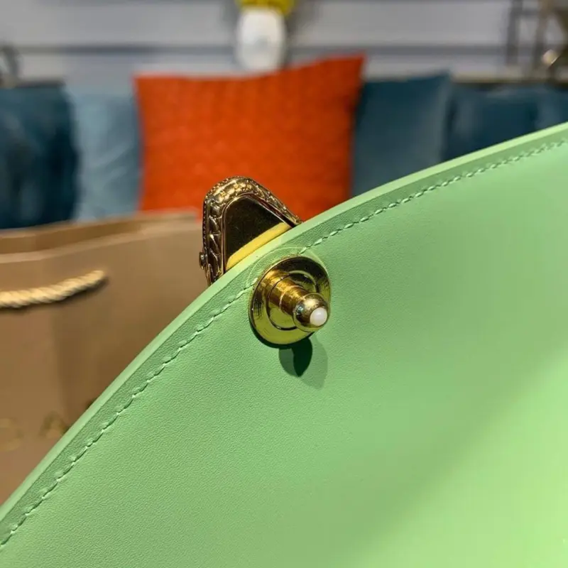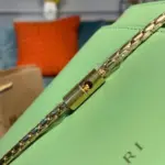 Experience a bold and edgy reinterpretation of a classic silhouette with this stunning top-handle shoulder bag. Crafted from smooth, mint-colored calf leather, this piece is designed for a contemporary look. The bag’s structured form and high-quality materials make it a standout accessory for any occasion, blending timeless elegance with a modern, fashion-forward sensibility.