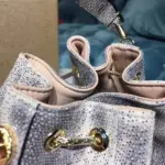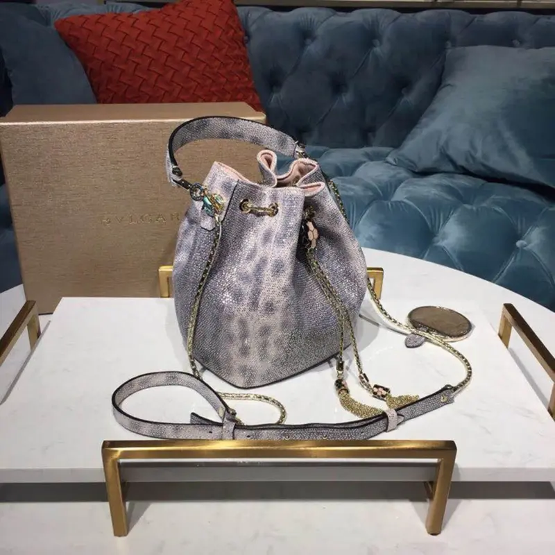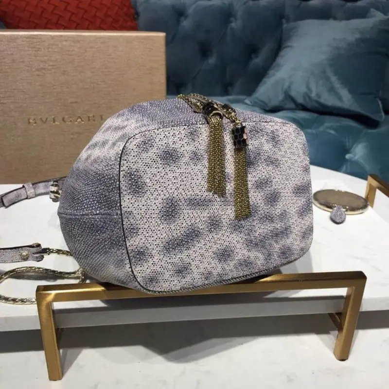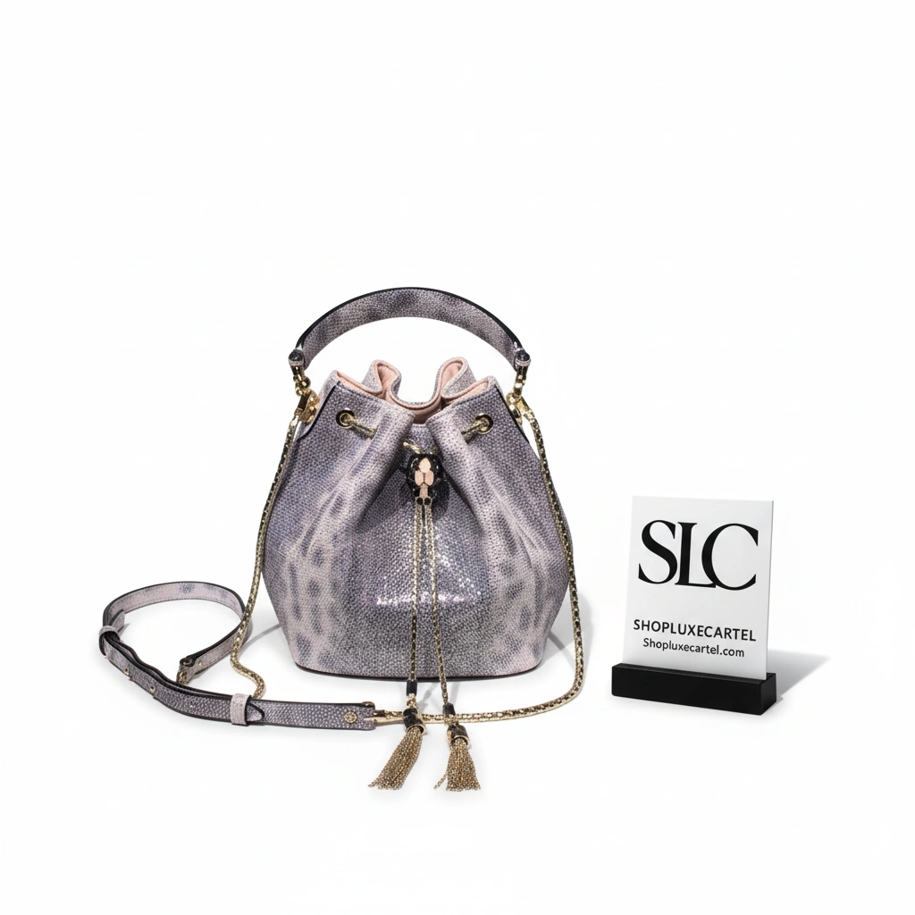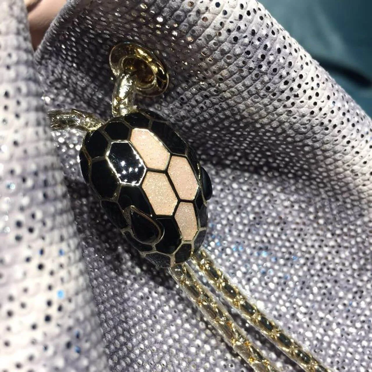 Experience sophisticated style with this contemporary bucket bag, meticulously crafted from precious white metallic karung skin for a truly luxurious look. This trendy piece features a unique drawstring closure composed of a delicate scale-motif chain, culminating in an iconic snakehead element for a powerful, hypnotic effect. The design is elegantly finished with gleaming light gold-plated brass hardware.