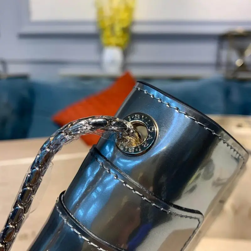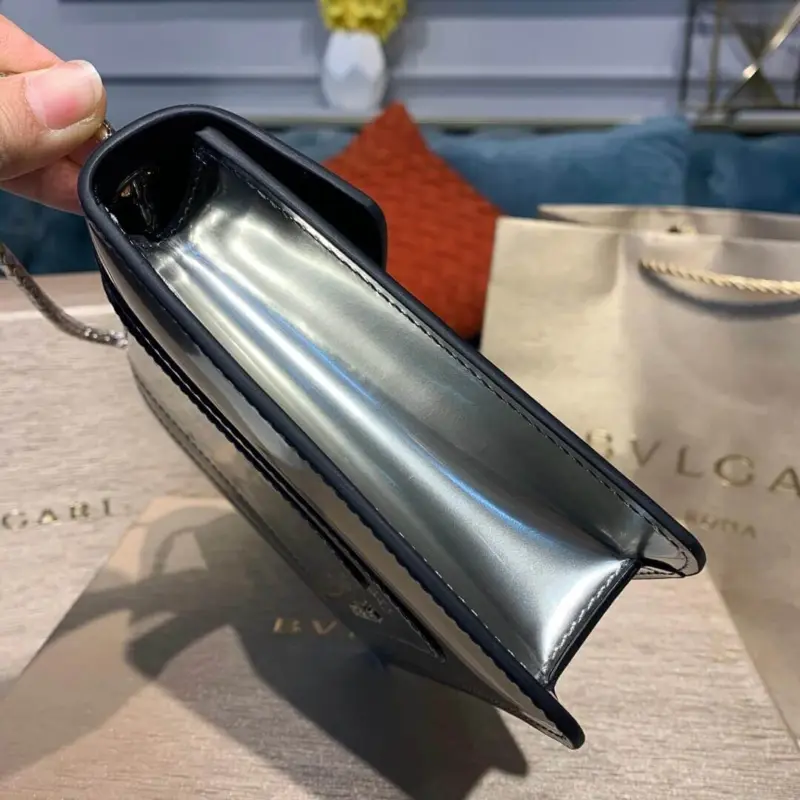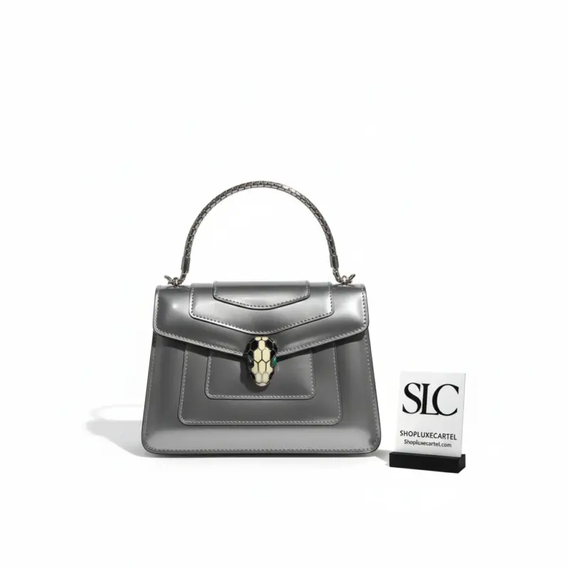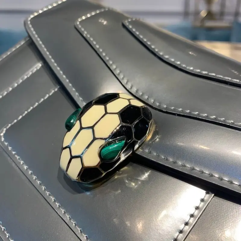 The bag’s most captivating feature is its unique flap closure, adorned with a light gold-plated, snake-head ornament. This meticulously detailed clasp features black and white enamel scales and is finished with striking green malachite eyes, adding a touch of mystique and artistry. The elegant, snake body-shaped chain strap completes the design, ensuring both comfort and style.