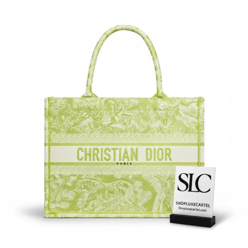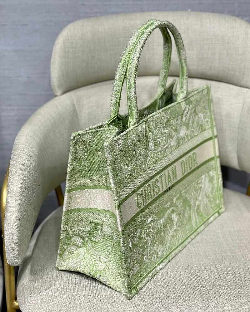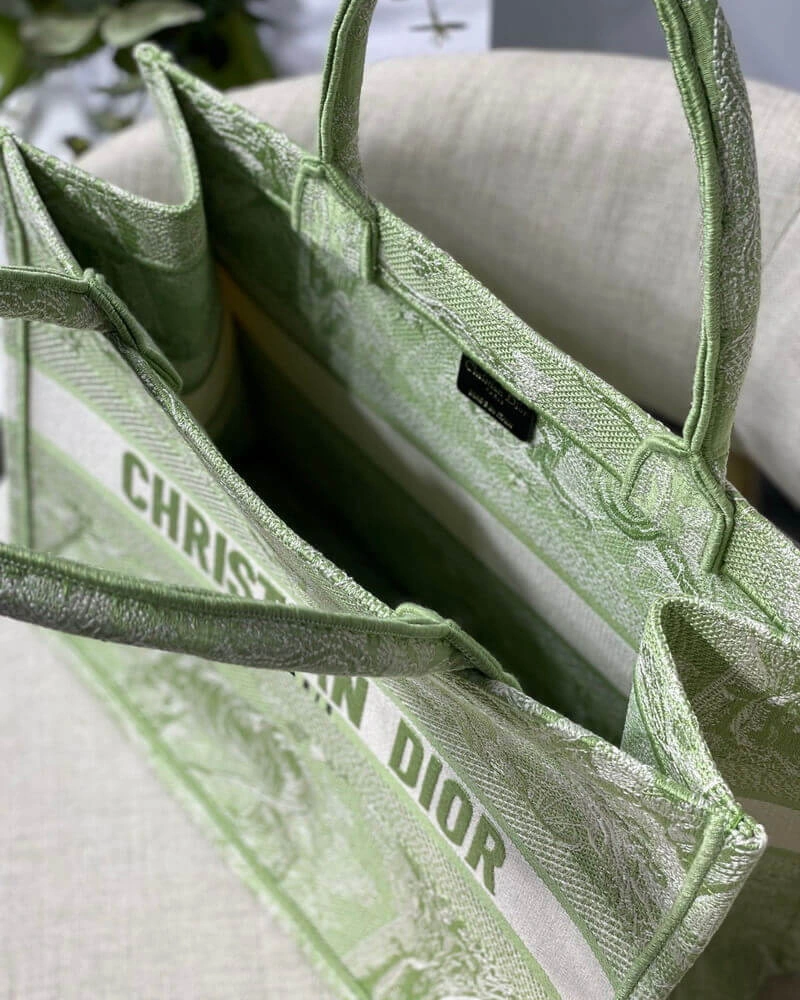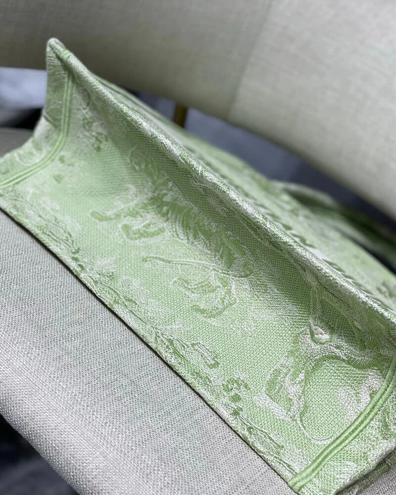 A beautifully crafted staple piece, this small tote is designed to hold all of your daily essentials. The entire bag is covered in a fully embroidered, lime-colored scenic motif, which features a clever play on reversed colors to offer a fresh take on a classic pattern. This tote exemplifies exquisite craftsmanship and is a perfect accessory for any collection.