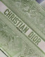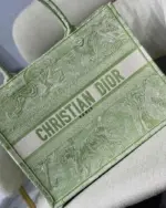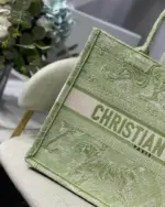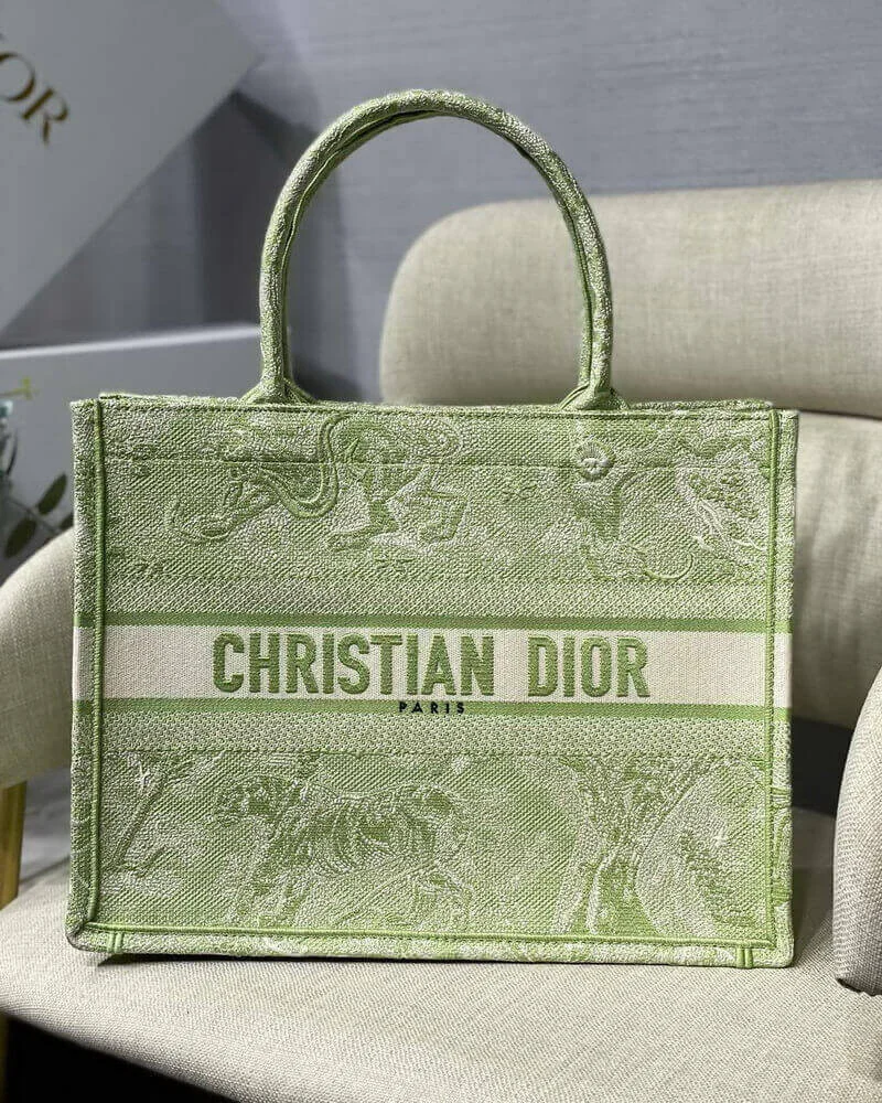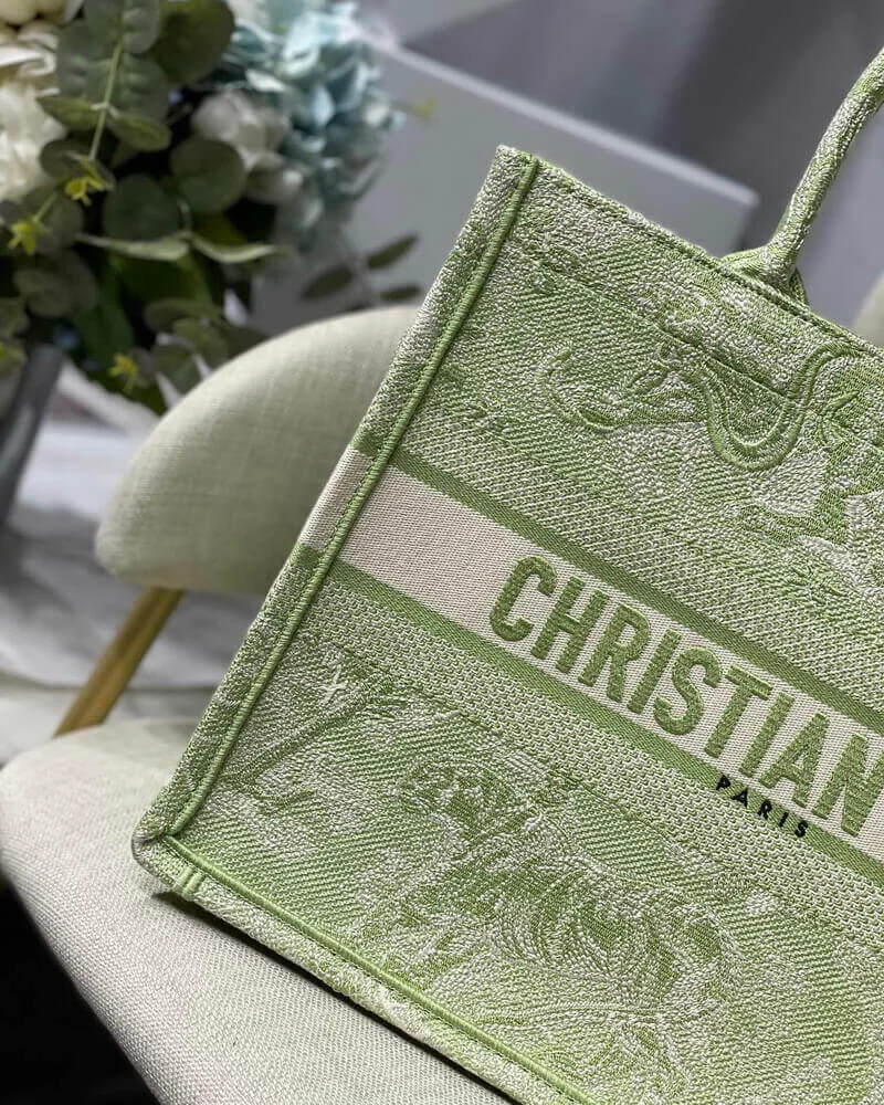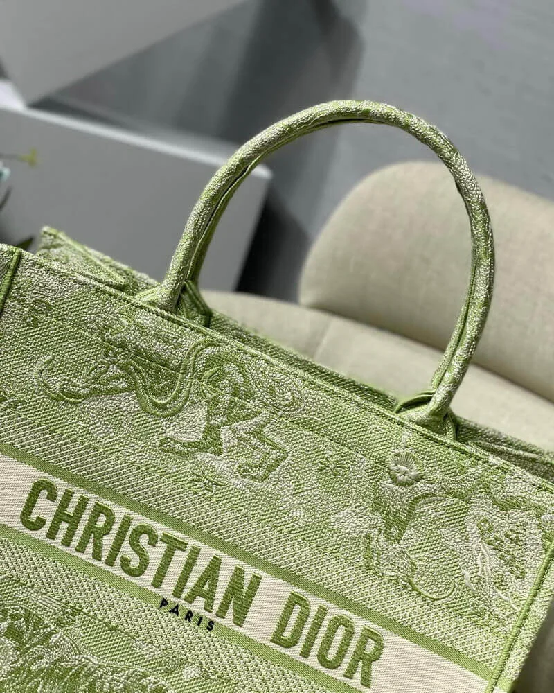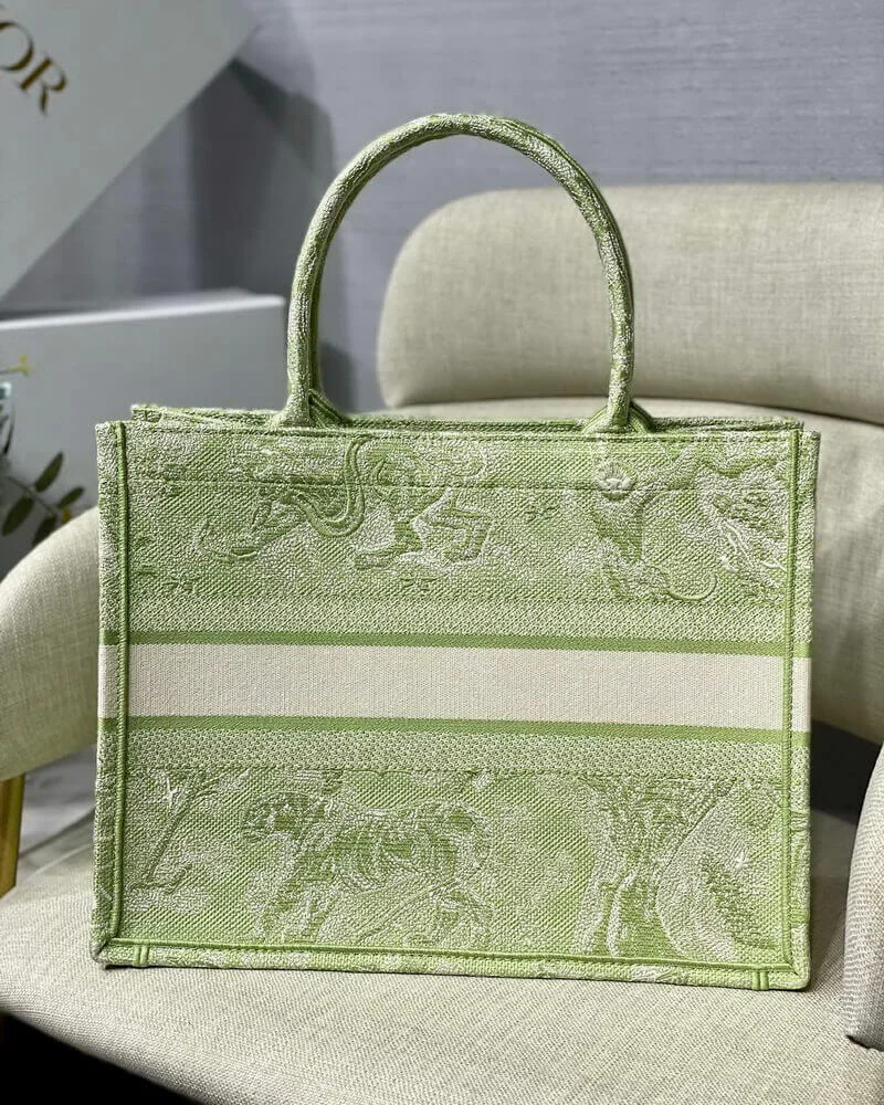 A beautifully crafted staple piece, this small tote is designed to hold all of your daily essentials. The entire bag is covered in a fully embroidered, lime-colored scenic motif, which features a clever play on reversed colors to offer a fresh take on a classic pattern. This tote exemplifies exquisite craftsmanship and is a perfect accessory for any collection.