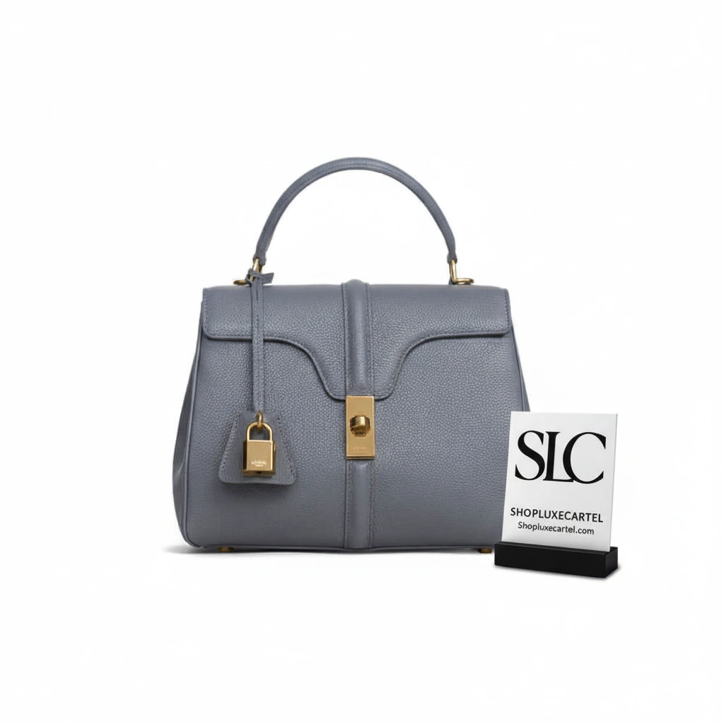 Experience timeless elegance with this beautifully crafted top handle bag, rendered in luxurious grained calfskin. Its structured silhouette exudes sophistication, making it a versatile accessory for any occasion. The bag features a polished gold-tone metal turn-lock closure that opens to reveal a well-organized interior. Carry it by the chic leather handle or attach the removable strap for shoulder or cross-body wear.
