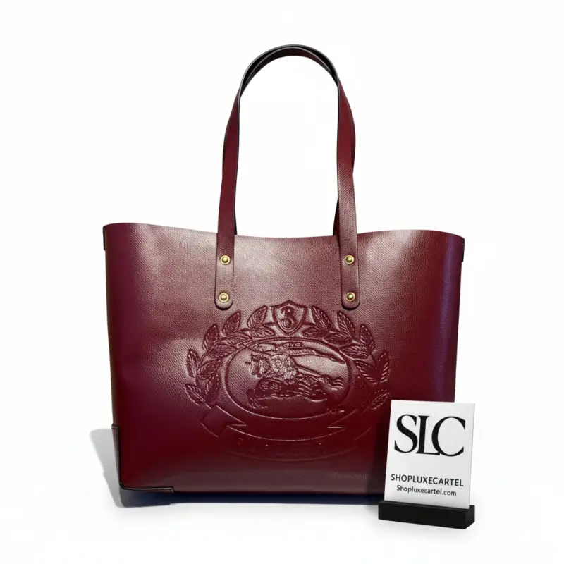 Discover a timeless accessory in this open-top tote, crafted from supple leather for a luxurious feel. The exterior is distinguished by an oversized embossed crest, adding a touch of heritage-inspired elegance. Inside, the bag is bonded to a classic, archival check pattern, creating a sophisticated contrast that celebrates traditional design.