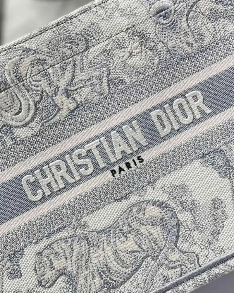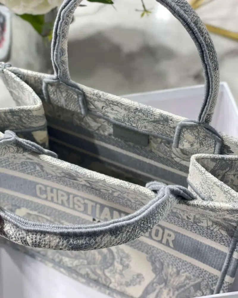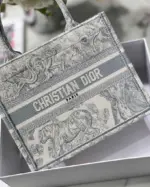 The bag is distinguished by a captivating, fully embroidered scenic pattern. This intricate grey “Toile de Jouy” motif is presented in a unique reverse-color design, adding a layer of contemporary artistry to the traditional pattern. The detailed embroidery covers the entire surface, creating a rich texture and a truly eye-catching finish that exemplifies high-quality craftsmanship.