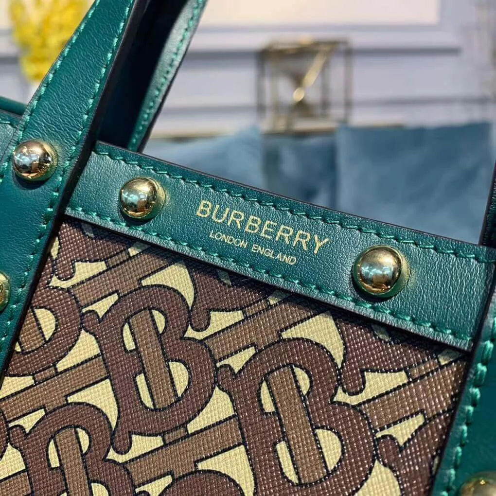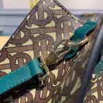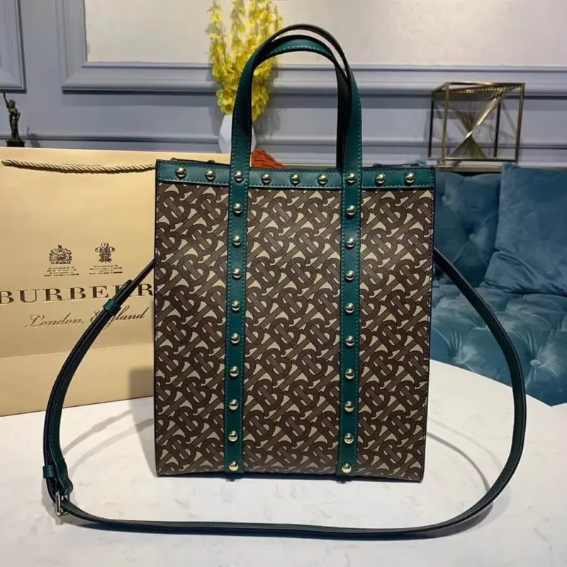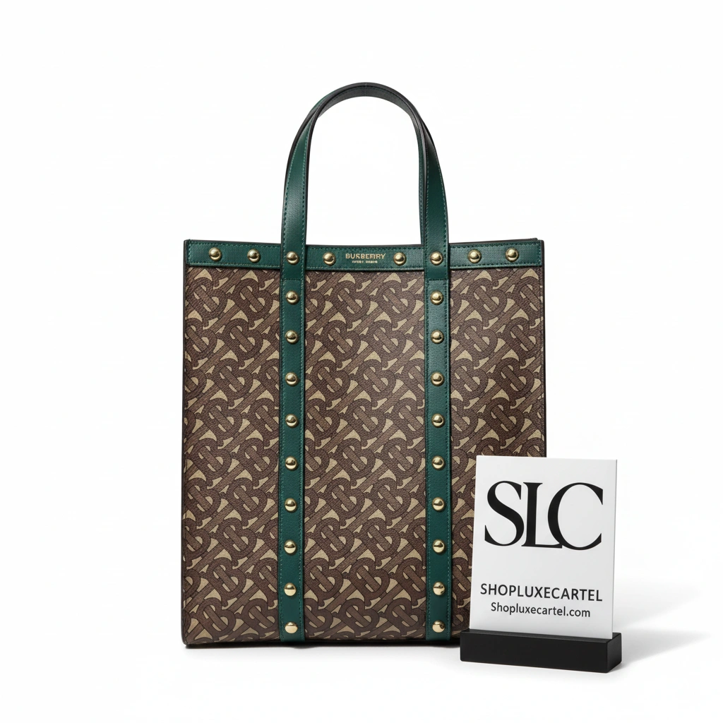 Discover superior Italian craftsmanship with this expertly designed portrait tote bag. This piece is constructed from an environmentally conscious e-canvas, a sustainable material primarily made using renewable resources that require less water and generate less CO2 than conventional coated canvases. The exterior is adorned with a distinctive monogram pattern and tastefully finished with studded leather trim for a refined, contemporary look.