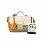 This piece is expertly crafted from a durable coated canvas with a distinctive geometric print, contrasted with smooth white and vibrant orange leather accents. The design is completed with polished, gold-toned hardware, an exterior pocket for easy access, and a versatile, detachable shoulder strap that allows it to be worn multiple ways. The interior is lined with a soft, suede-like microfiber, ensuring your essentials are protected in style.