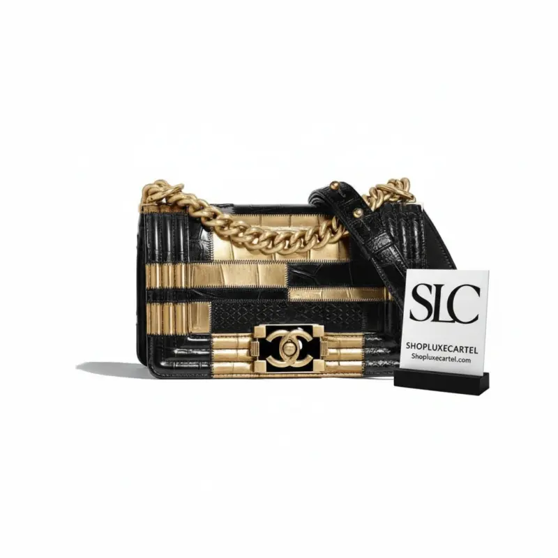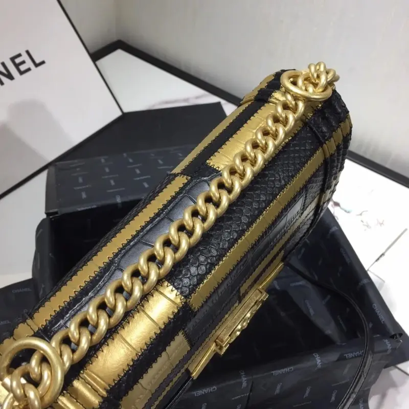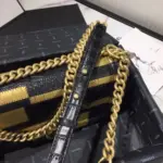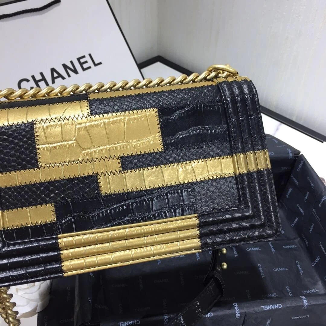 This beautifully structured shoulder bag combines timeless quilting with a bold, contemporary edge. Its clean lines and compact silhouette are enhanced by an exotic mix of crocodile and python embossed calfskin, creating a piece that is both luxurious and visually striking. The elegant gold and black color scheme makes it a versatile accessory, perfect for elevating any ensemble.