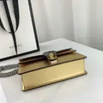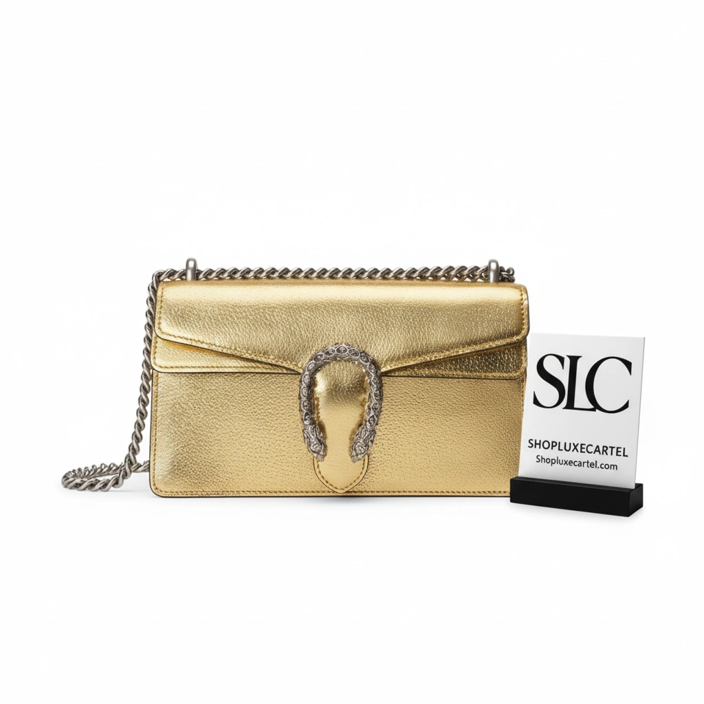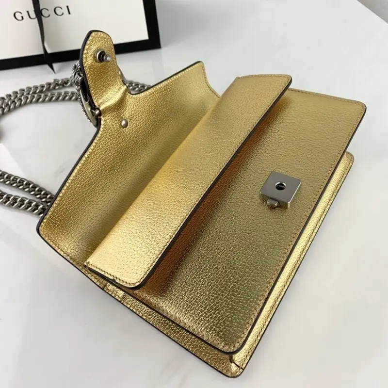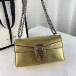 Elevate your ensemble with this exquisitely crafted shoulder bag, presented in a brilliant, shimmering gold leather. Designed for sophistication, this piece features a structured silhouette that is both timeless and contemporary. The bag’s most striking feature is an ornate, crystal-embellished tiger head clasp, a unique detail that adds a touch of opulence and character to its design.
