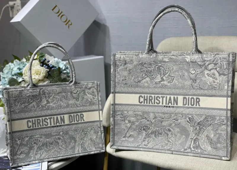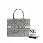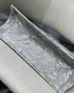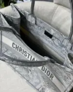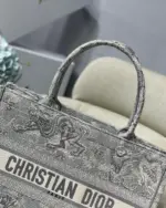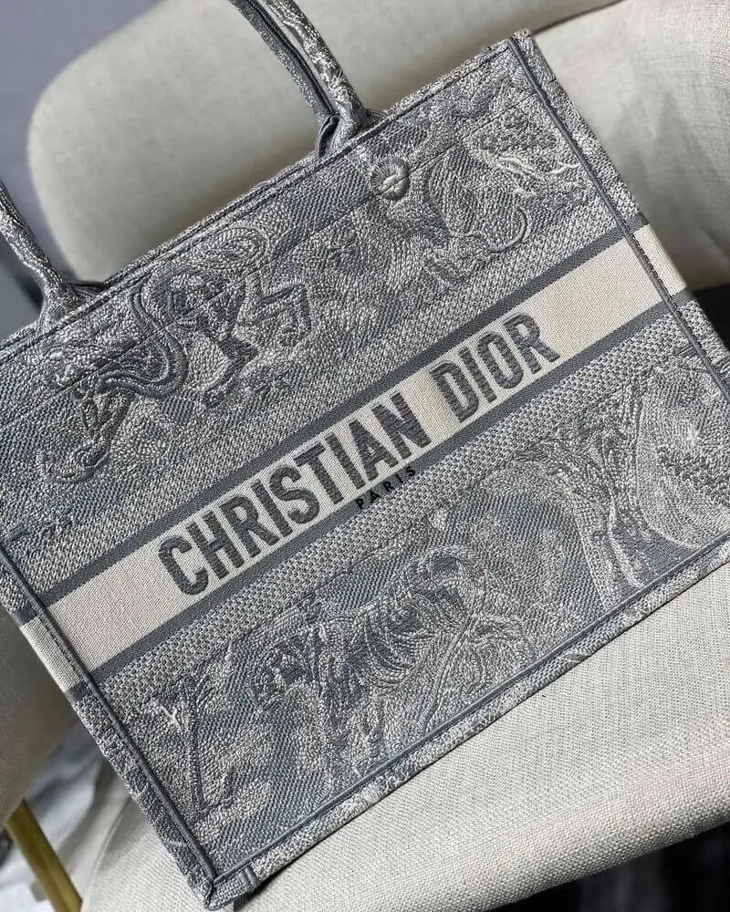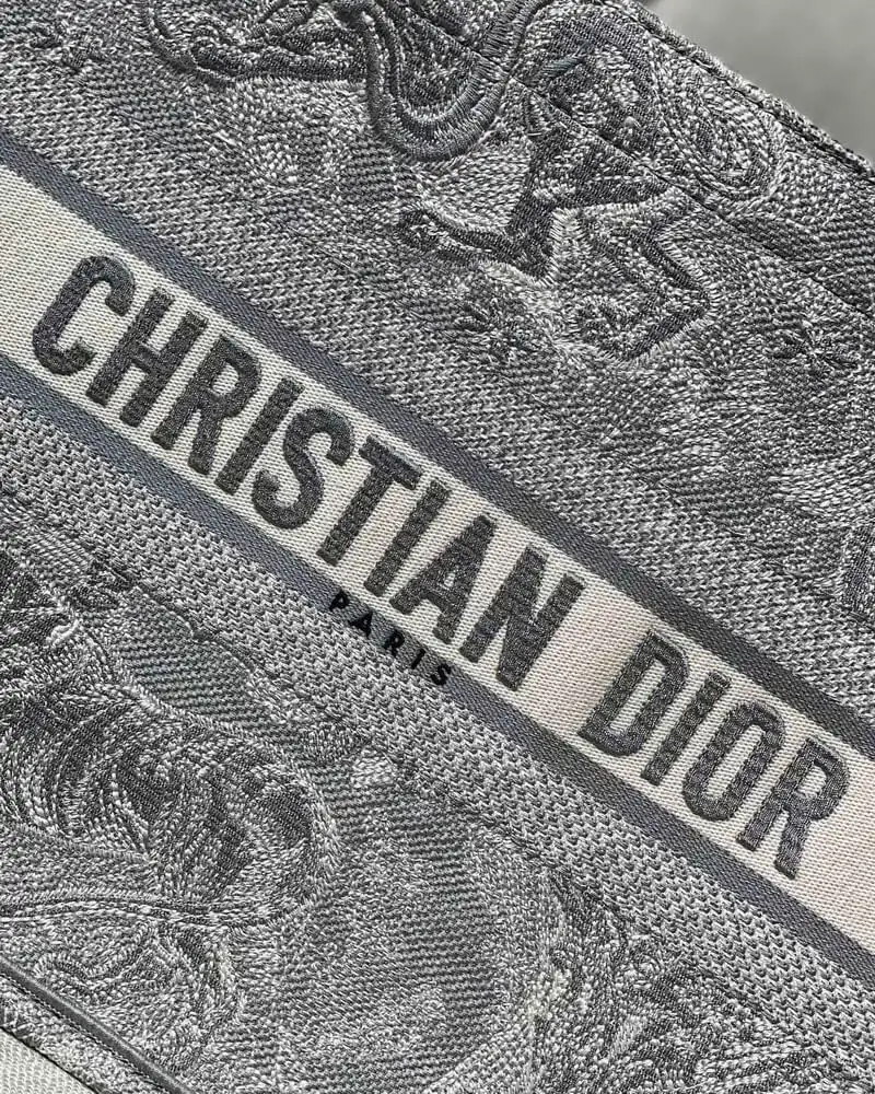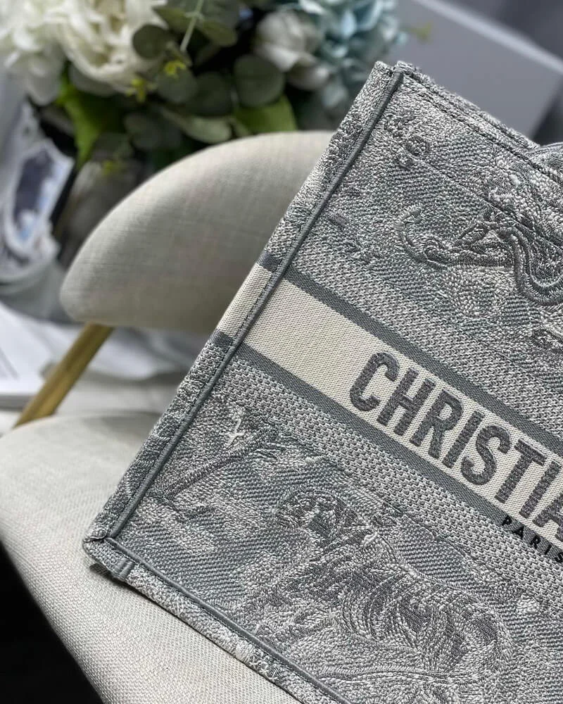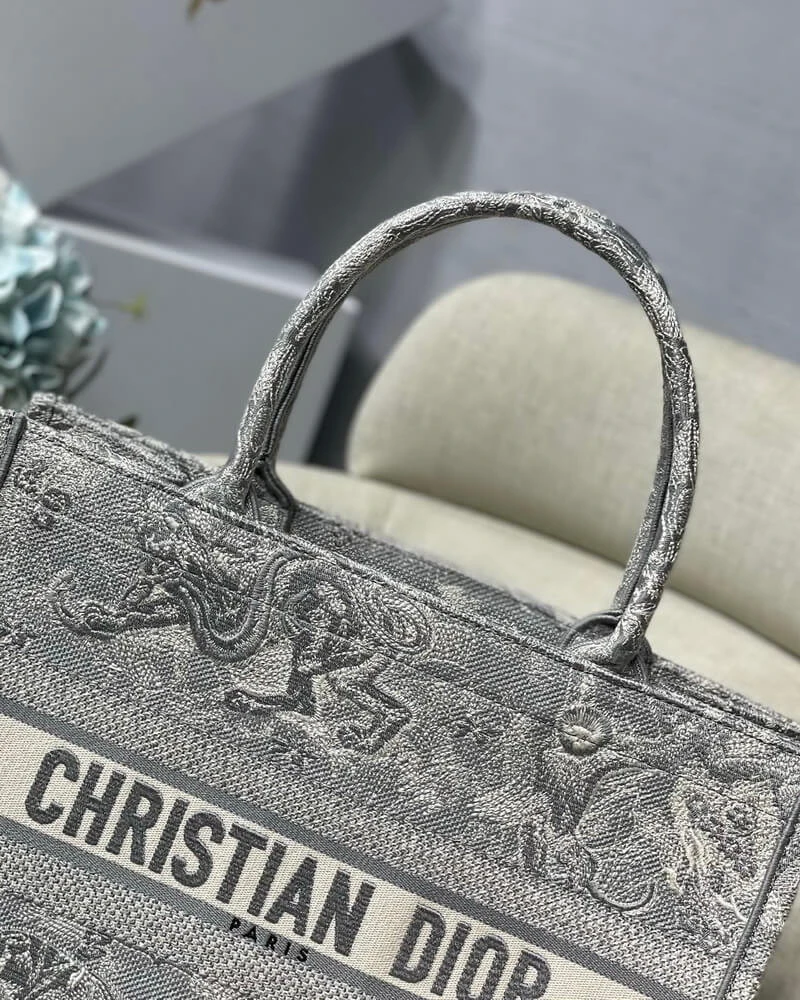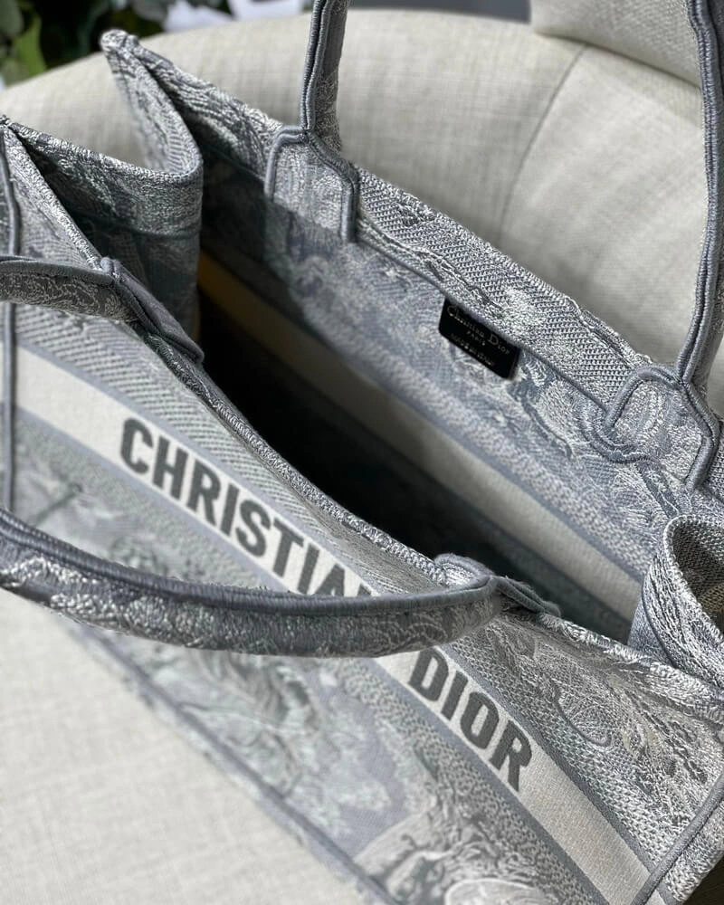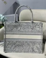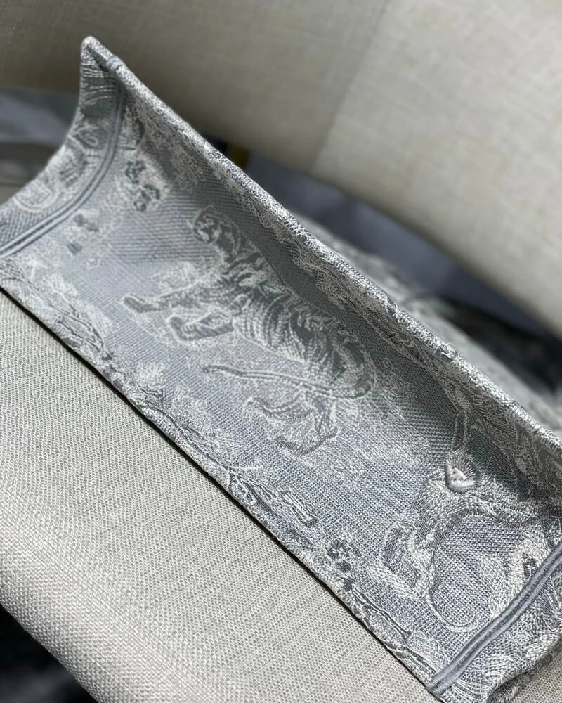 Experience timeless sophistication with this exquisitely structured tote bag, a perfect accessory for the modern style enthusiast. The bag is adorned with a classic grey Toile de Jouy embroidery, depicting intricate pastoral scenes that lend an air of classic artistry to its design. Its elegant, open-top silhouette makes it a versatile and essential piece for any collection.