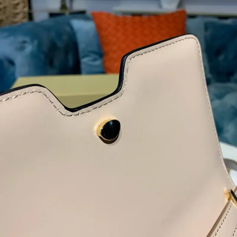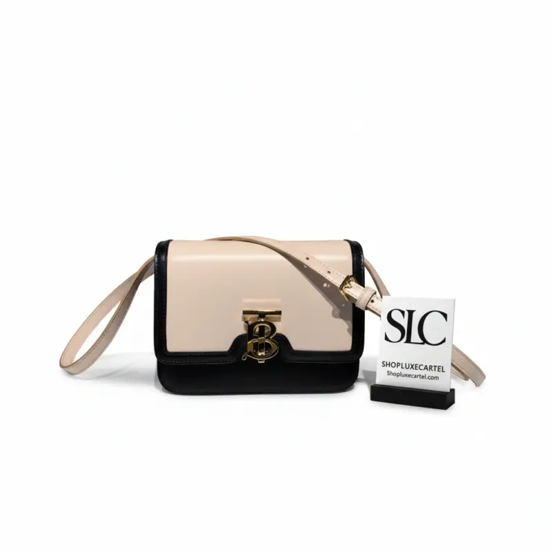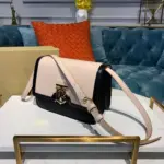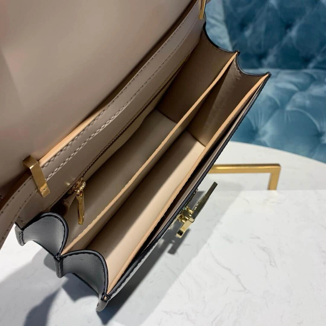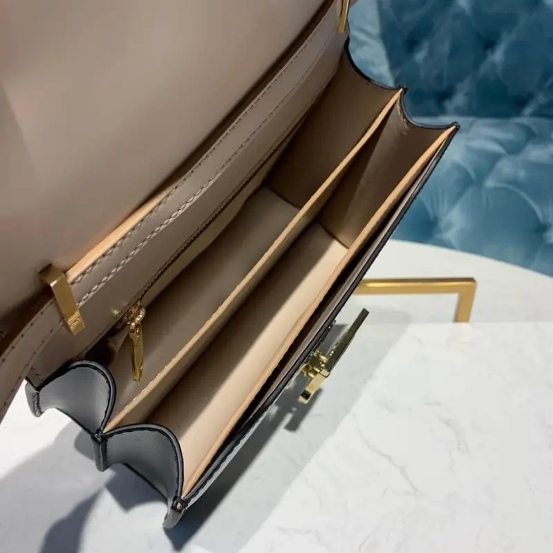This beautifully structured bag, crafted from premium two-tone calf leather, offers timeless sophistication and exceptional versatility. Its clean, architectural lines are complemented by polished metal hardware and a distinctive monogram clasp, creating a look of understated luxury. The thoughtful design allows it to be carried as an elegant clutch, worn over the shoulder, or styled as a hands-free crossbody to suit any occasion.