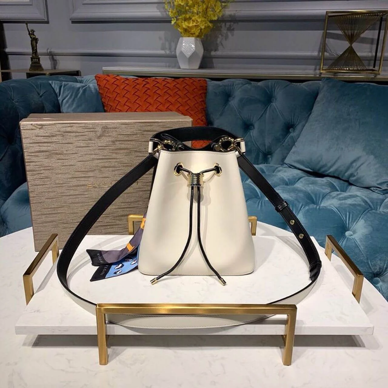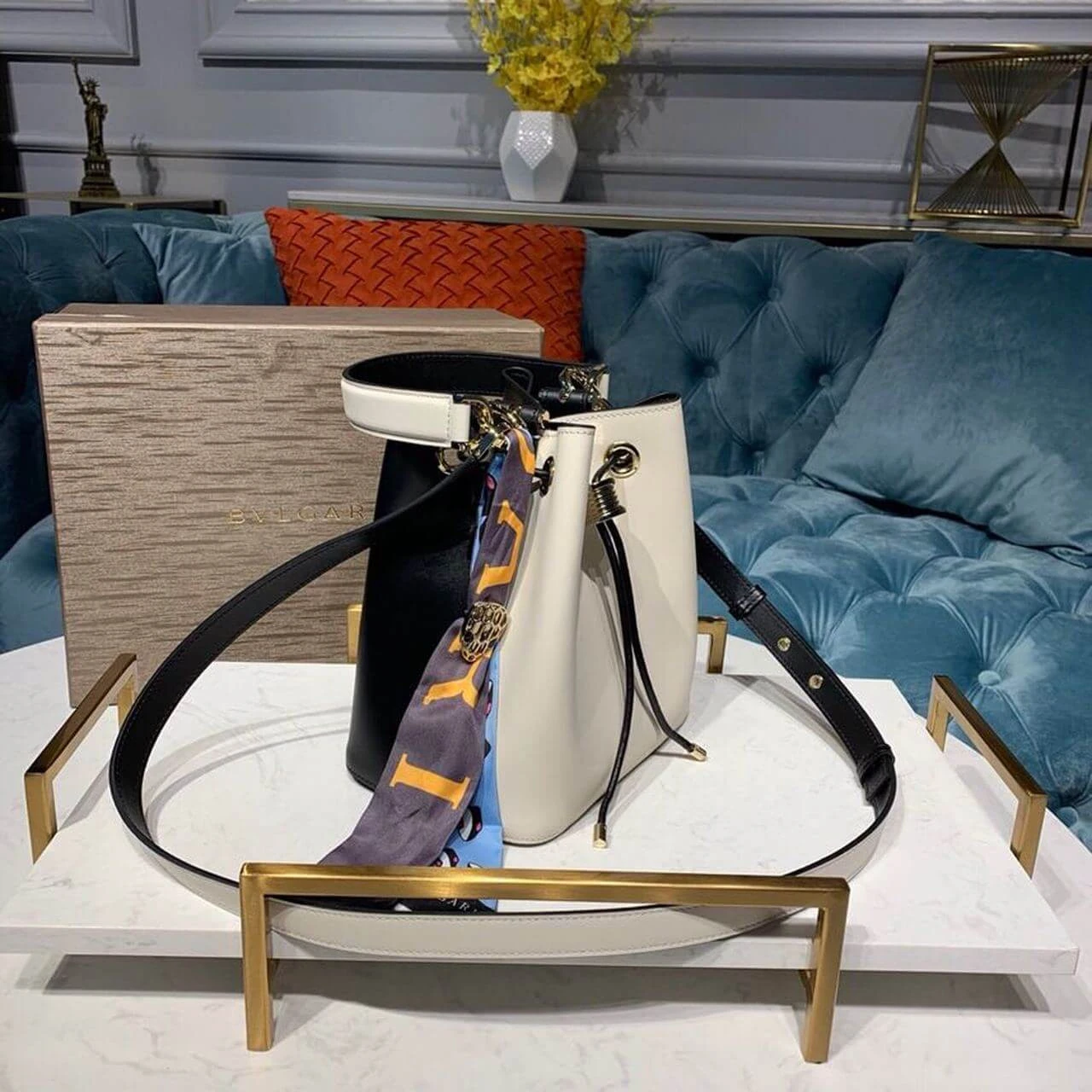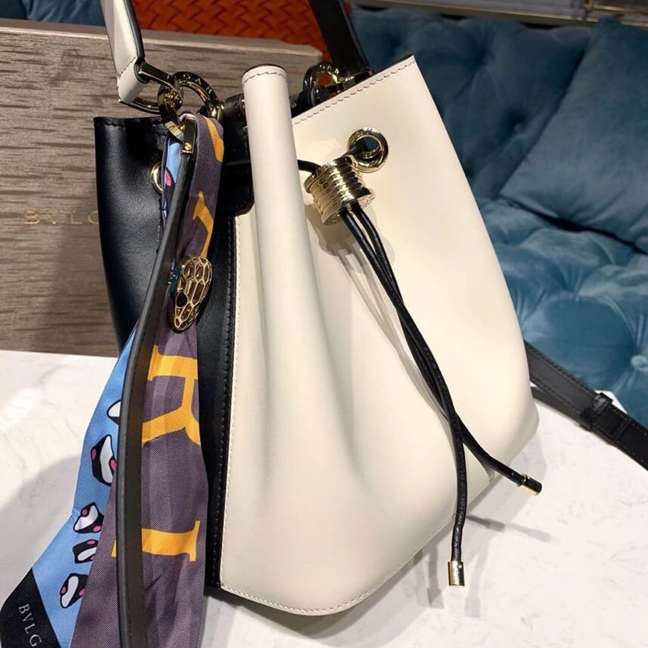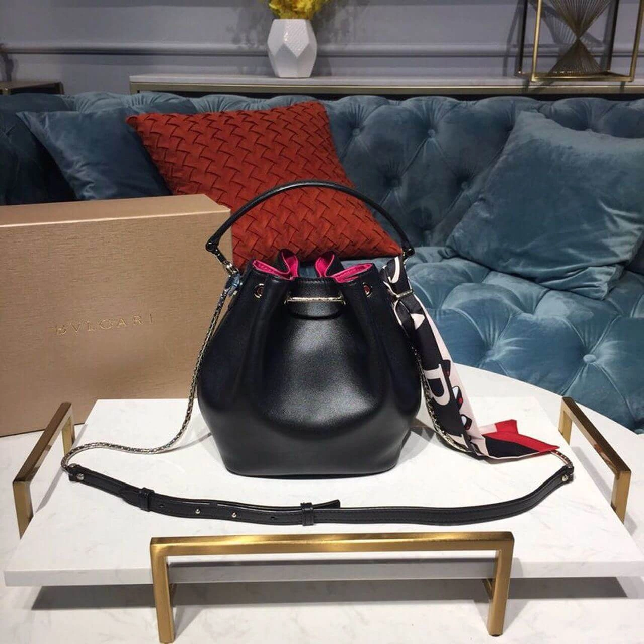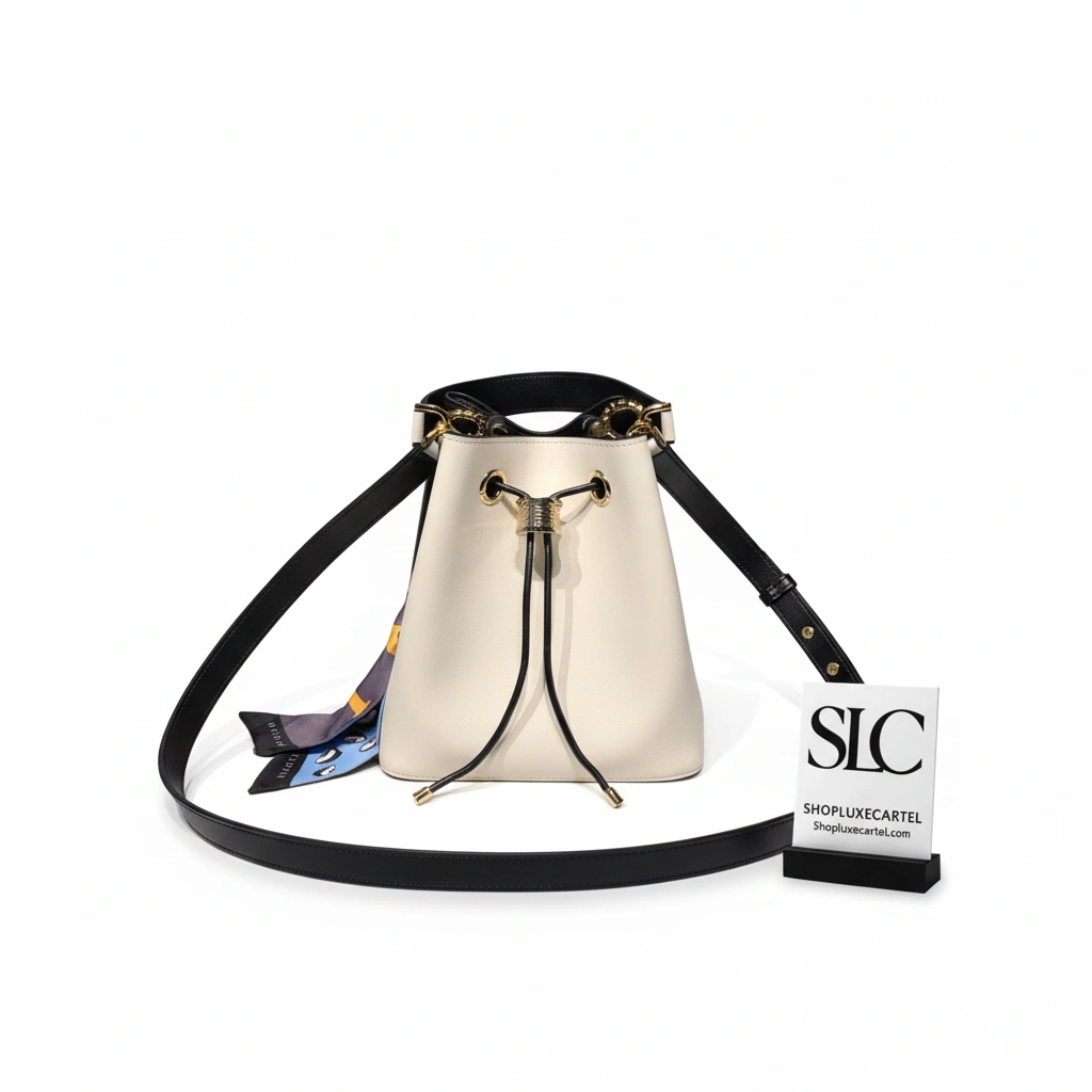 This bag’s captivating design is centered around its unique closure system, featuring a functional drawstring made from a scale-motif chain. The design is secured by a powerful and hypnotic snake head motif, rendered in striking black and white enamel with mesmerizing black onyx eyes. For versatile wear, it includes a detachable top handle and a gleaming, light gold-plated chain strap, allowing for comfortable carry by hand, on the shoulder, or crossbody.