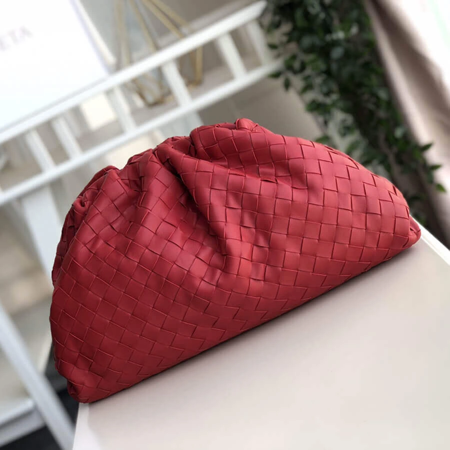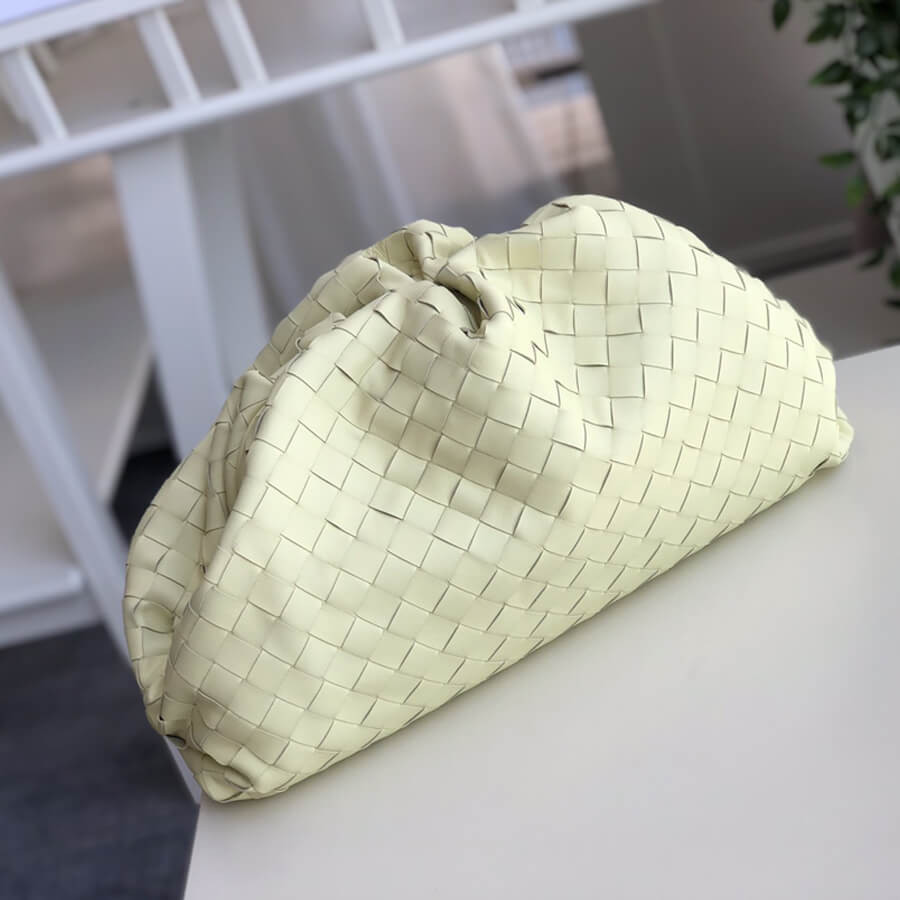 Experience effortless sophistication with this beautifully designed pouch clutch. Characterized by its voluminous, cloud-like shape, the bag is crafted from supple leather that is intricately woven to create a soft, gathered effect. This clutch features a structured magnetic frame that adds a touch of modern minimalism to its sculptural form, making it a versatile and elegant accessory for any occasion.