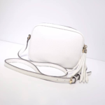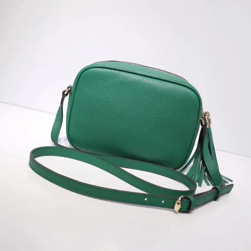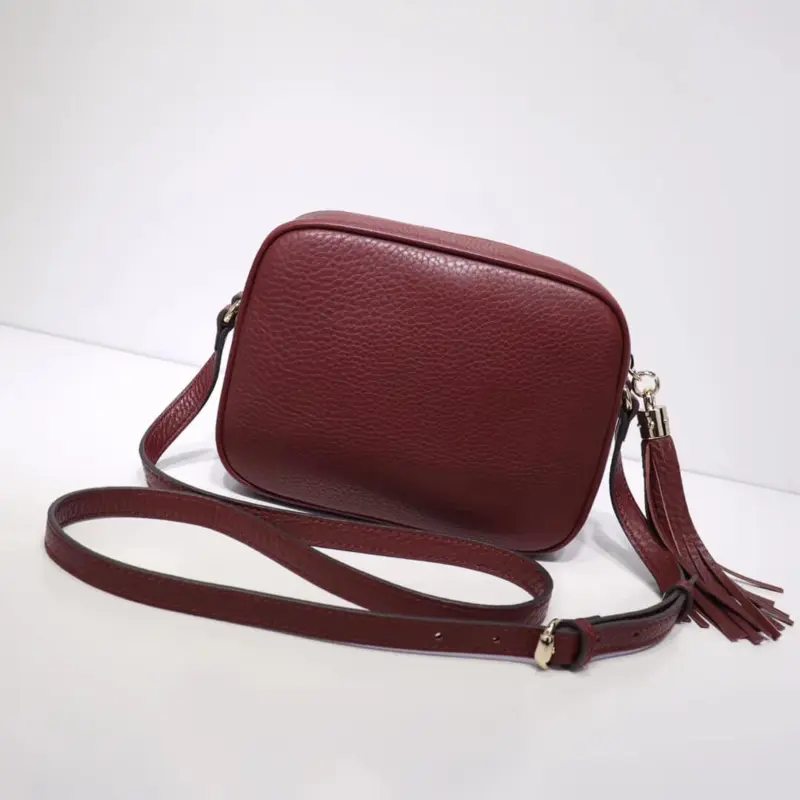 Notable features include a charming leather tassel that adorns the zipper pull and an elegant embossed emblem on the front for a touch of refined detail. The adjustable leather strap allows for comfortable wear, either on the shoulder or as a crossbody, making it a truly versatile addition to any wardrobe.