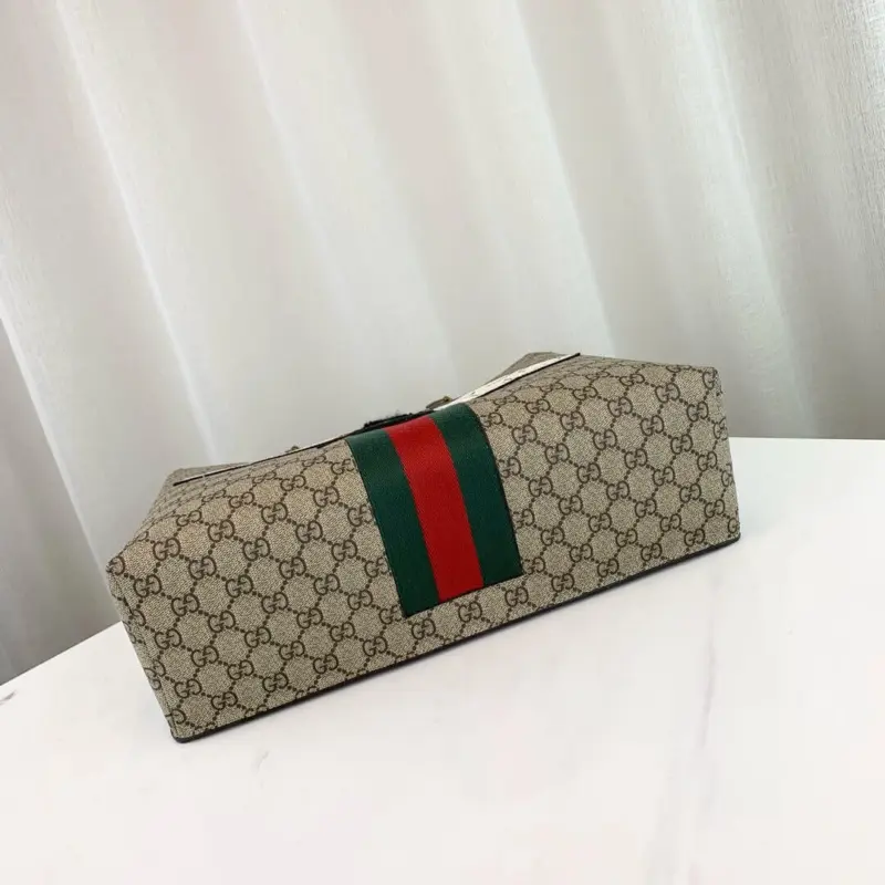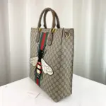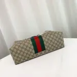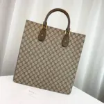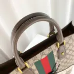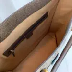 This spacious tote is framed with rich brown leather trim and features a signature striped webbing detail for a classic look. It offers versatile carrying options with comfortable rolled top handles and an optional, adjustable shoulder strap, all accented with polished gold-tone hardware. The top opens to reveal a roomy dark grey microfiber interior, complete with zipper and patch pockets to keep your essentials organized.
