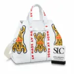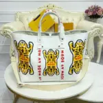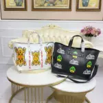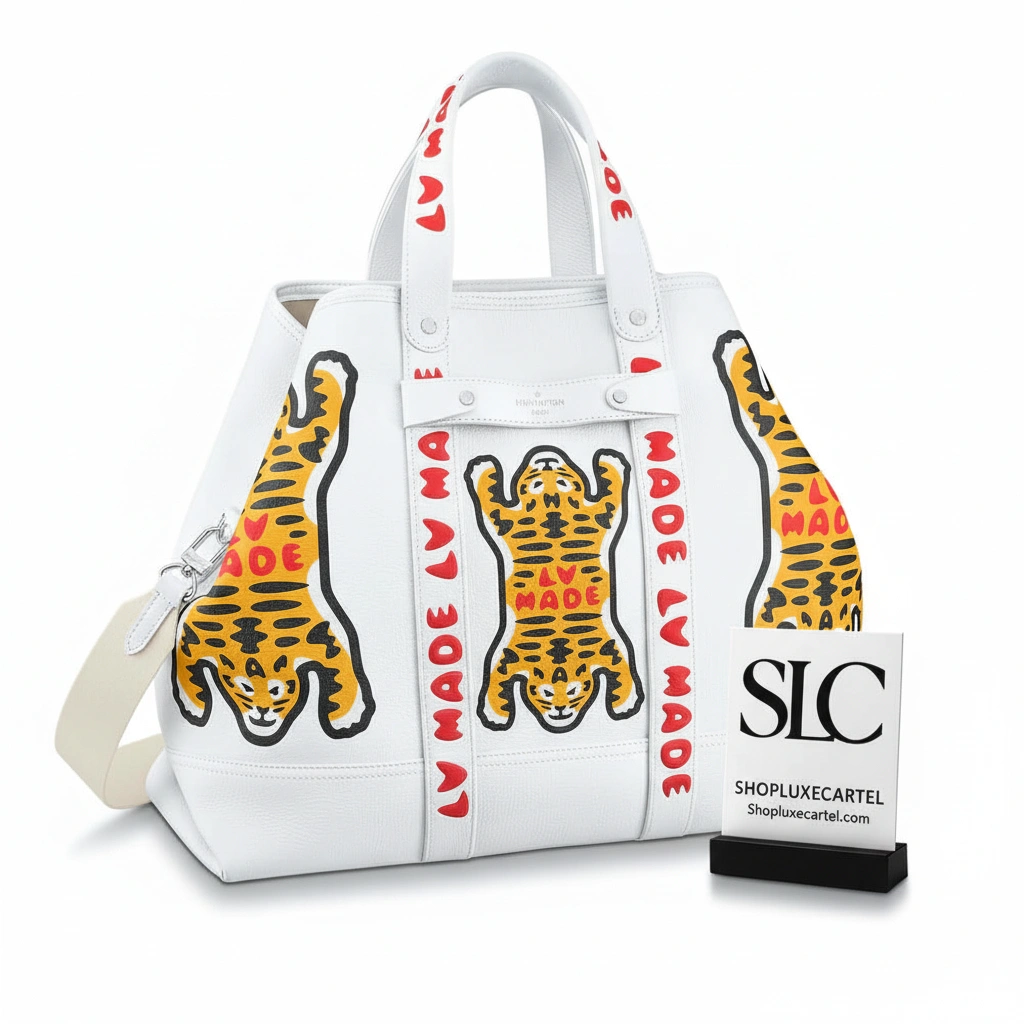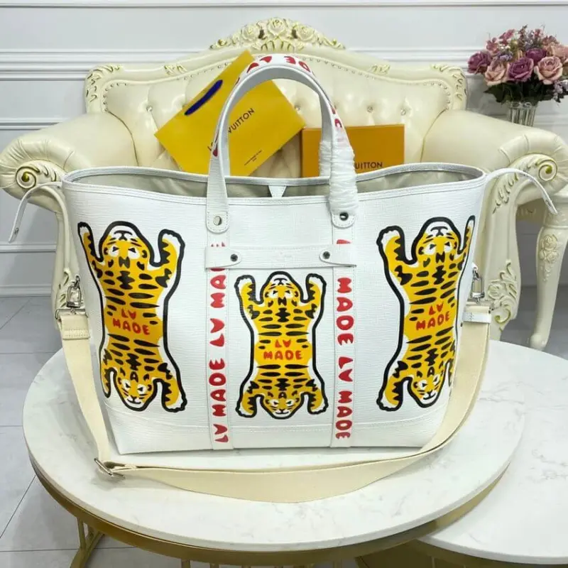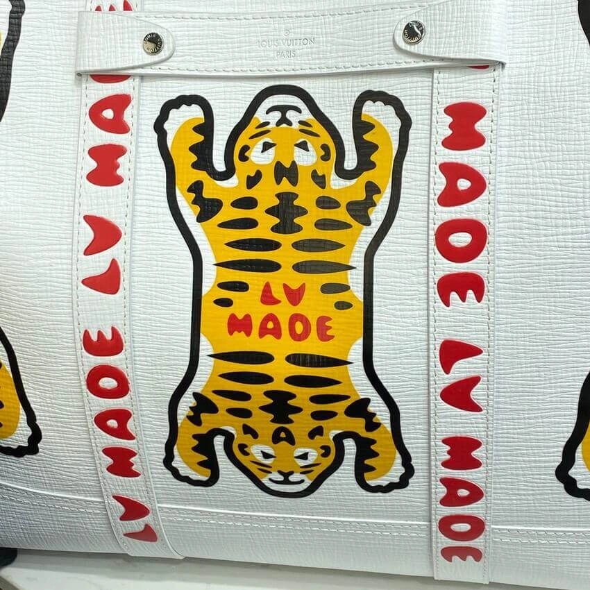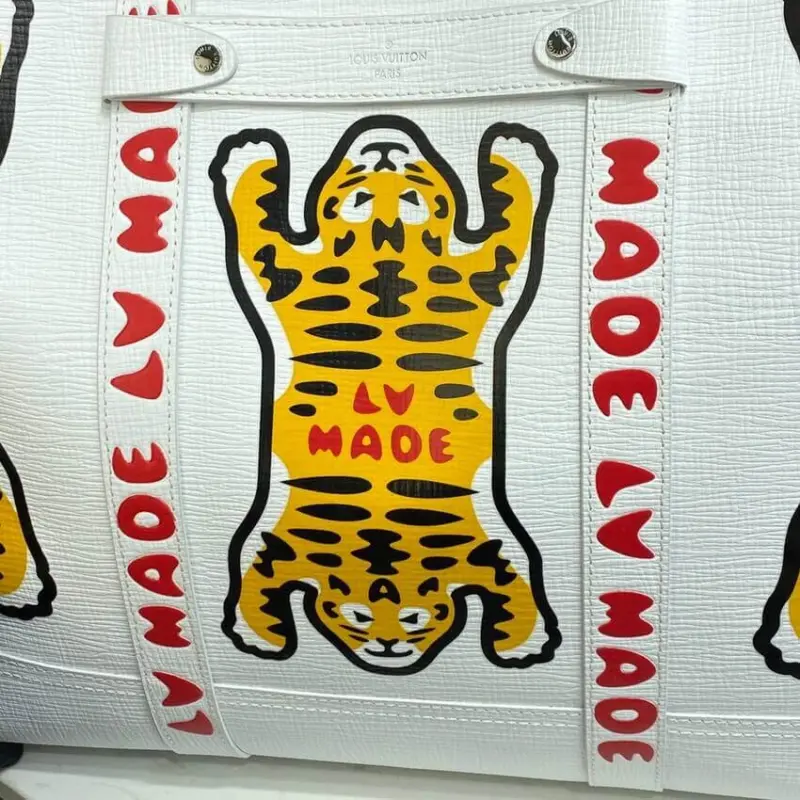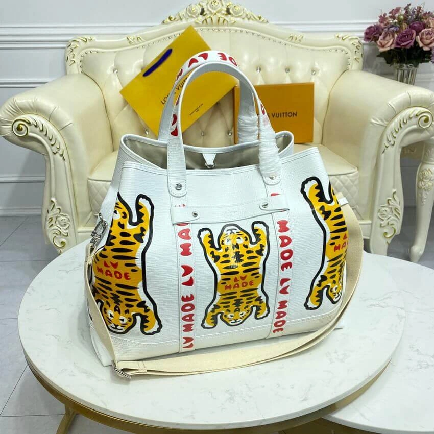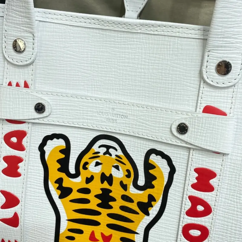 This journey tote makes a bold statement with its distinctive, street-inspired tiger graphic, offering a cutting-edge look for any occasion. Designed for versatility, its generous capacity makes it the perfect companion for a day in the city or a weekend getaway. The design is elevated by thoughtful details reminiscent of classic trunk-making, including leather reinforcement straps and sturdy rivets.