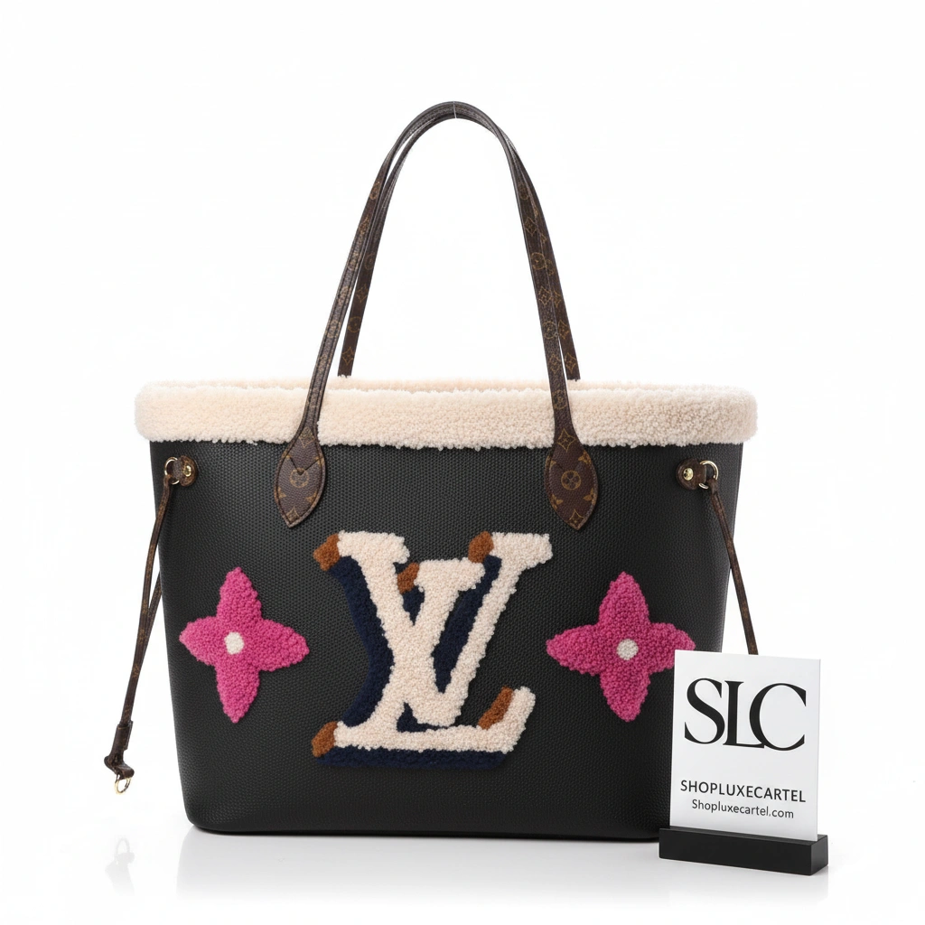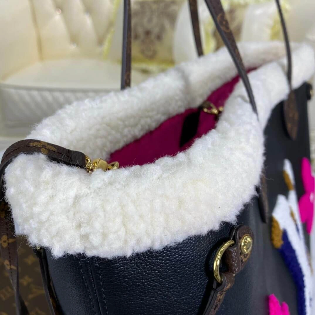Discover your new essential accessory with this beautifully crafted tote bag, perfect for everyday elegance. This piece features a sophisticated combination of supple, grained black leather and a luxurious, ultra-soft shearling trim for a cozy yet chic aesthetic. Adding a touch of artistry, different colors of shearling are patchworked together to create a distinctive floral and initial motif.