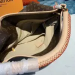 This hobo bag captures an effortlessly chic, bohemian style, making it a perfect everyday companion. Crafted from a durable and supple coated canvas featuring a timeless monogram pattern, its slouchy silhouette is both spacious and sophisticated. The design is beautifully accented with rich, gold-tone metallic hardware and an exquisitely braided, handcrafted leather handle that ensures comfortable shoulder or elbow carry.